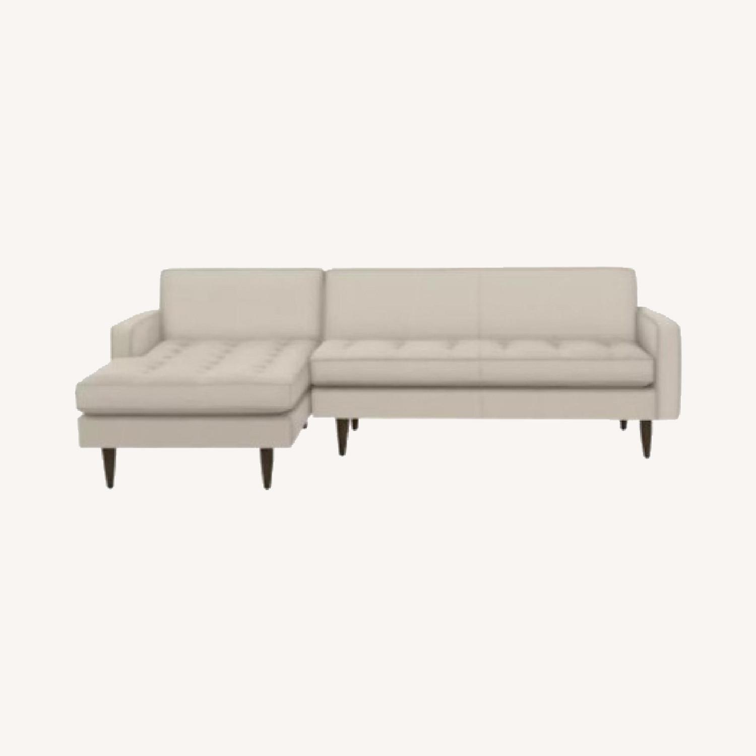 Seller's Notes:This Reese sectional sofa is amazing, but sadly does not fit in our new apartment. This couch can comfortably fit three people, and is not too firm or soft. The color of this couch is a warm blue/grey; the fabric is made of blue grey and taupe yarns. The photo with my hand is the most accurate for color. The fabric type is a bouclé. The couch is high quality with a solid wood, and is made in America. Four of the feet were replaced, and so there are four teak colored feet and four dark brown feet. The teak feet are pictured, as that’s what I use on the outward facing feet. There is scuffing on the feet, some wear on the chaise arm, and the seat cushion of the couch. The clasp that connects the chaise and sofa needs to be replaced. I am the original owner, and I do not have cats, but I do have a small dog. This couch was professionally steam cleaned on 5/20/21, so it is ready for it’s new home!