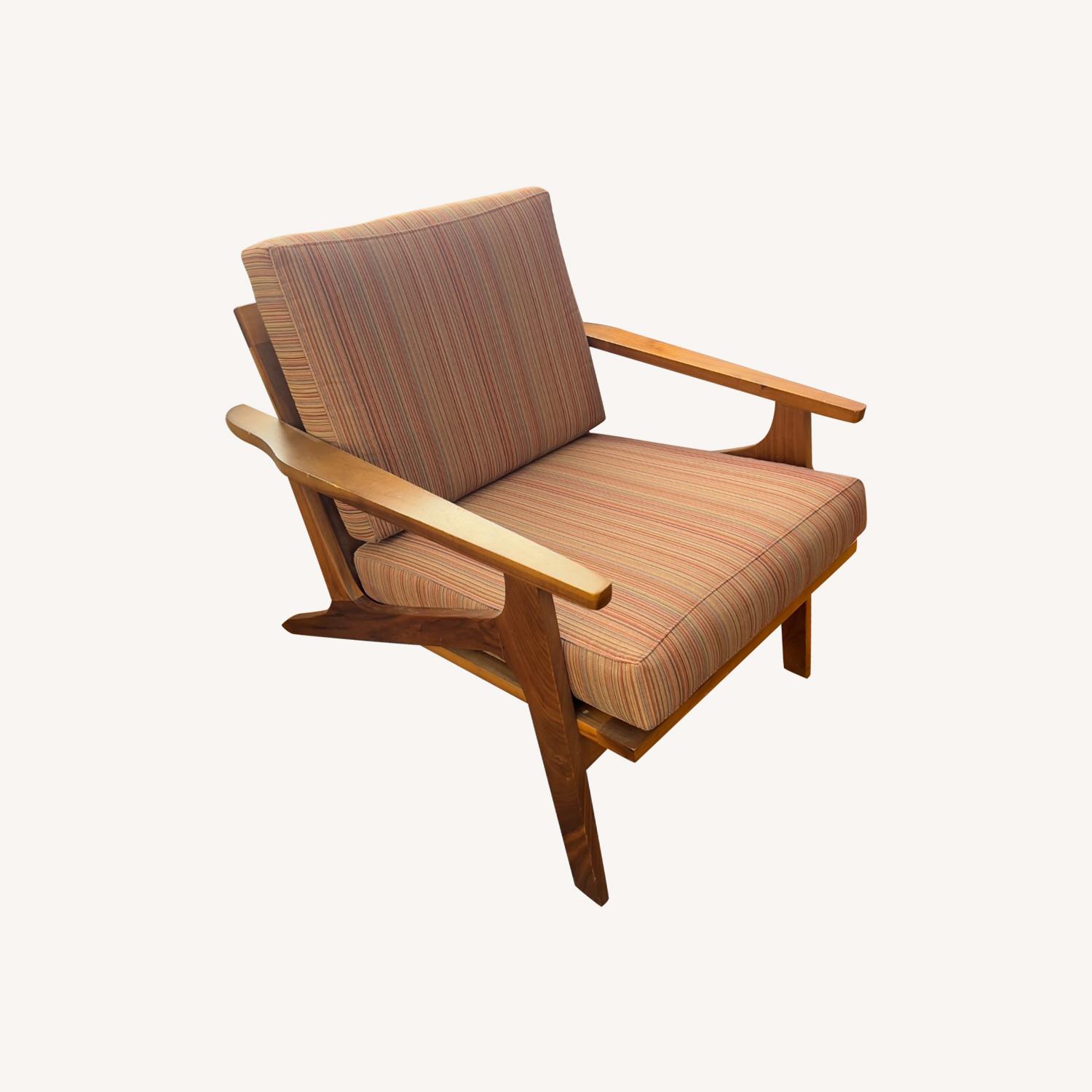 Seller's Notes:Walnut Sanna Chair with Striped Cushions from Room & Board in good condition. Comfortable and a great size for New York! Cushions have almost no sign of wear and the scratches on the arms are fairly minor and could be easily repaired, but it is priced accordingly.