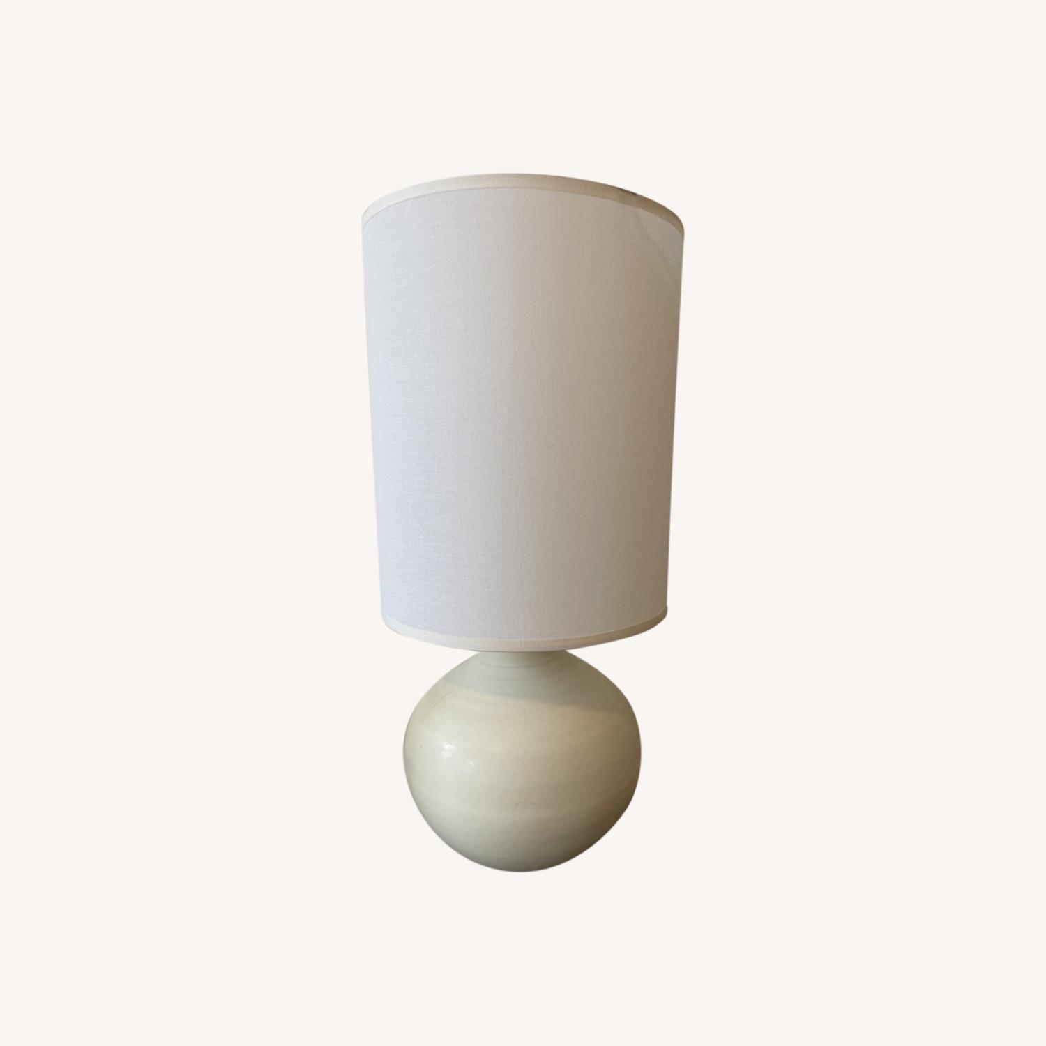 Seller's Notes:Beautiful room & board table lamp. Ceramic off white base, drum white linen shade.