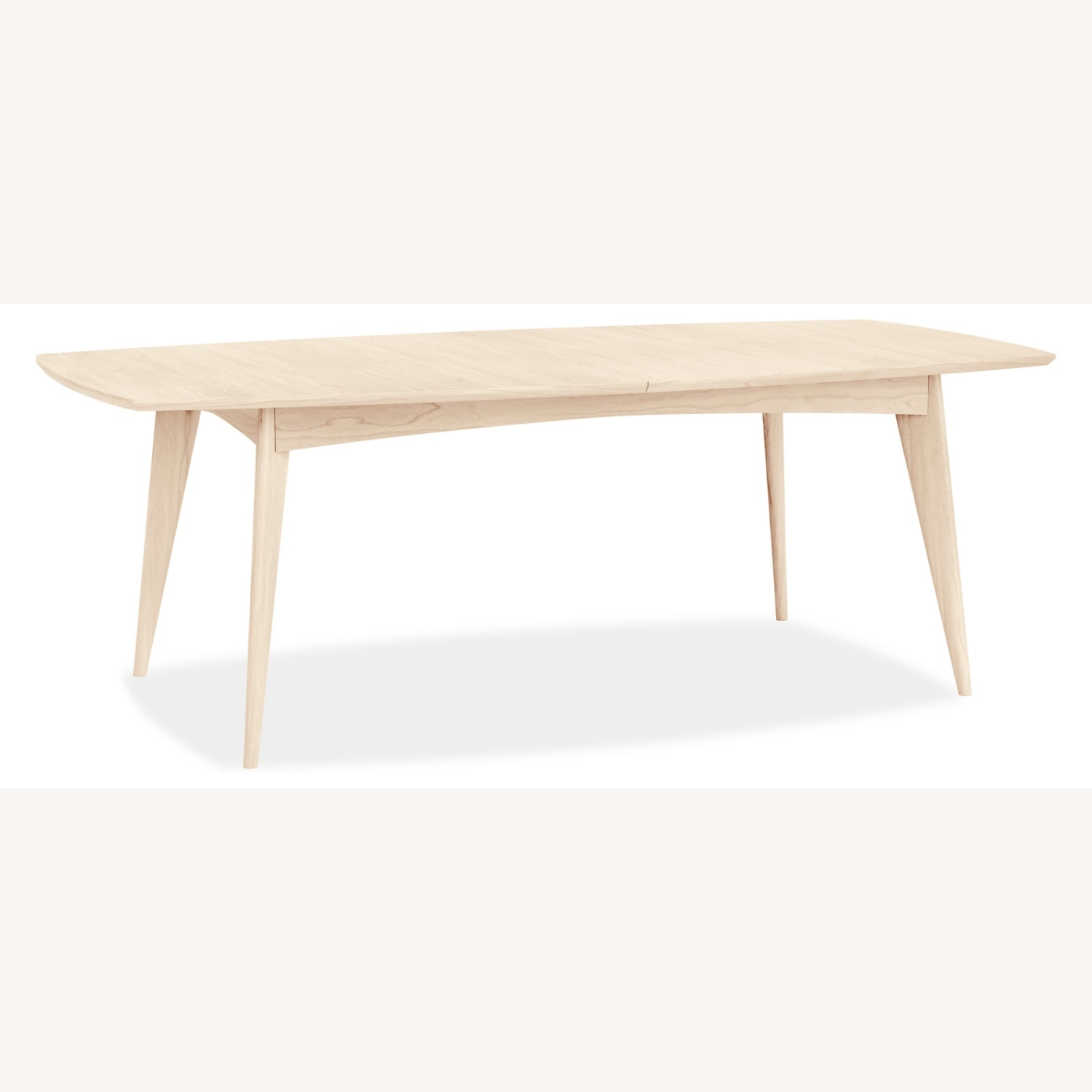 A beautifully shaped top and splayed, tapered legs give the Ventura extension table mid-century appeal. Built in West Virginia, the reverse-beveled top edge is indicative of the care and craftsmanship that go into each table. Combined with the warm look of solid wood, the Ventura extension table is a long-lasting dining solution with infinite style. This table includes a built-in leaf so you can easily seat two additional guests. Simply pull the table from both ends to reveal the leaf. Then push down on the built-in leaf and watch it smoothly unfold into place.