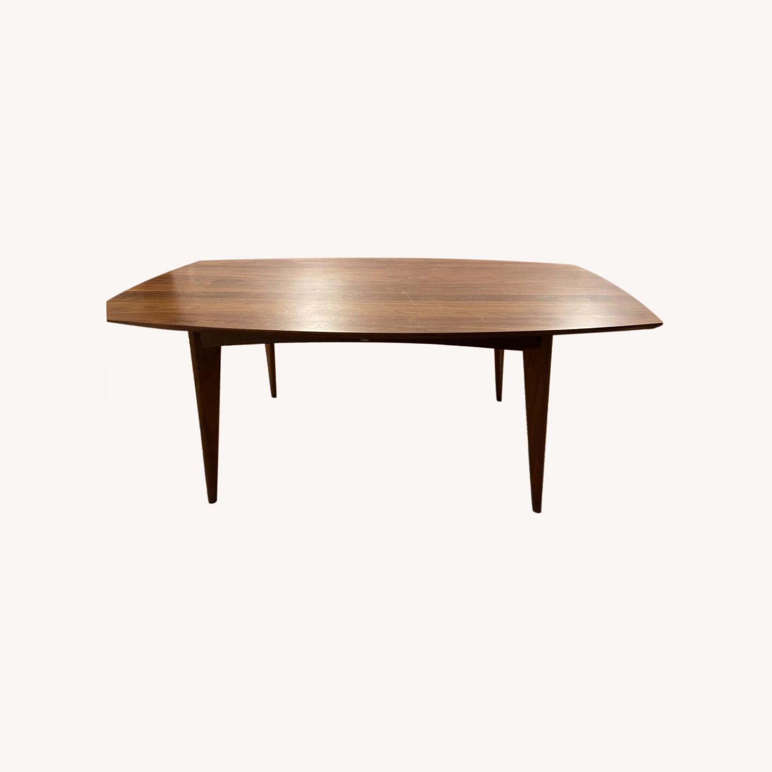 Seller's Notes:Ventura MADE IN AMERICA A beautifully shaped top and splayed, tapered legs give Ventura a distinctly mid-century look. Made in West Virginia, the reverse-beveled top edge and unique, tapered legs are indicative of the care and craftsmanship that goes into each table. The design showcases the warm, distinctive look of solid wood.