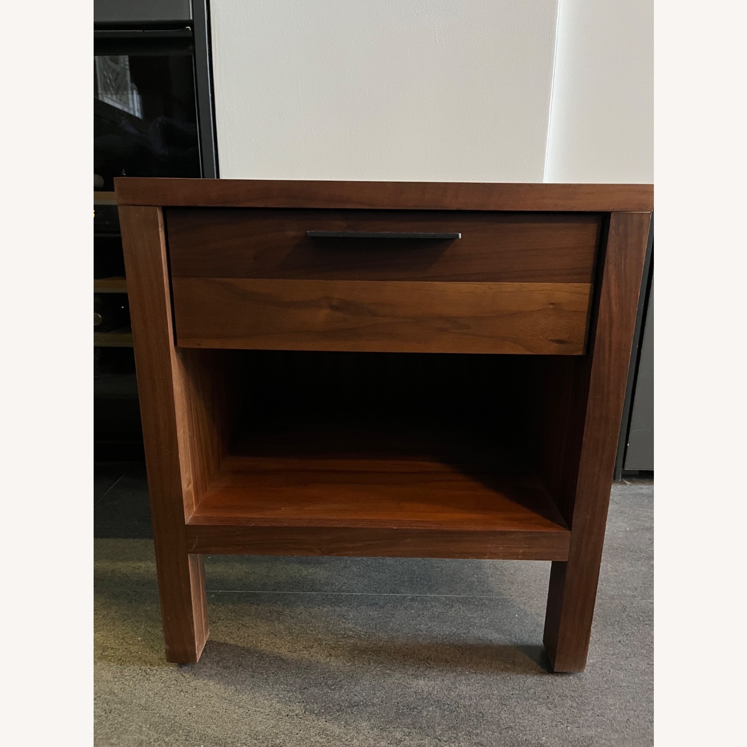 Seller's Notes:Emerson style walnut side table with drawer from Room & Board. Good condition.