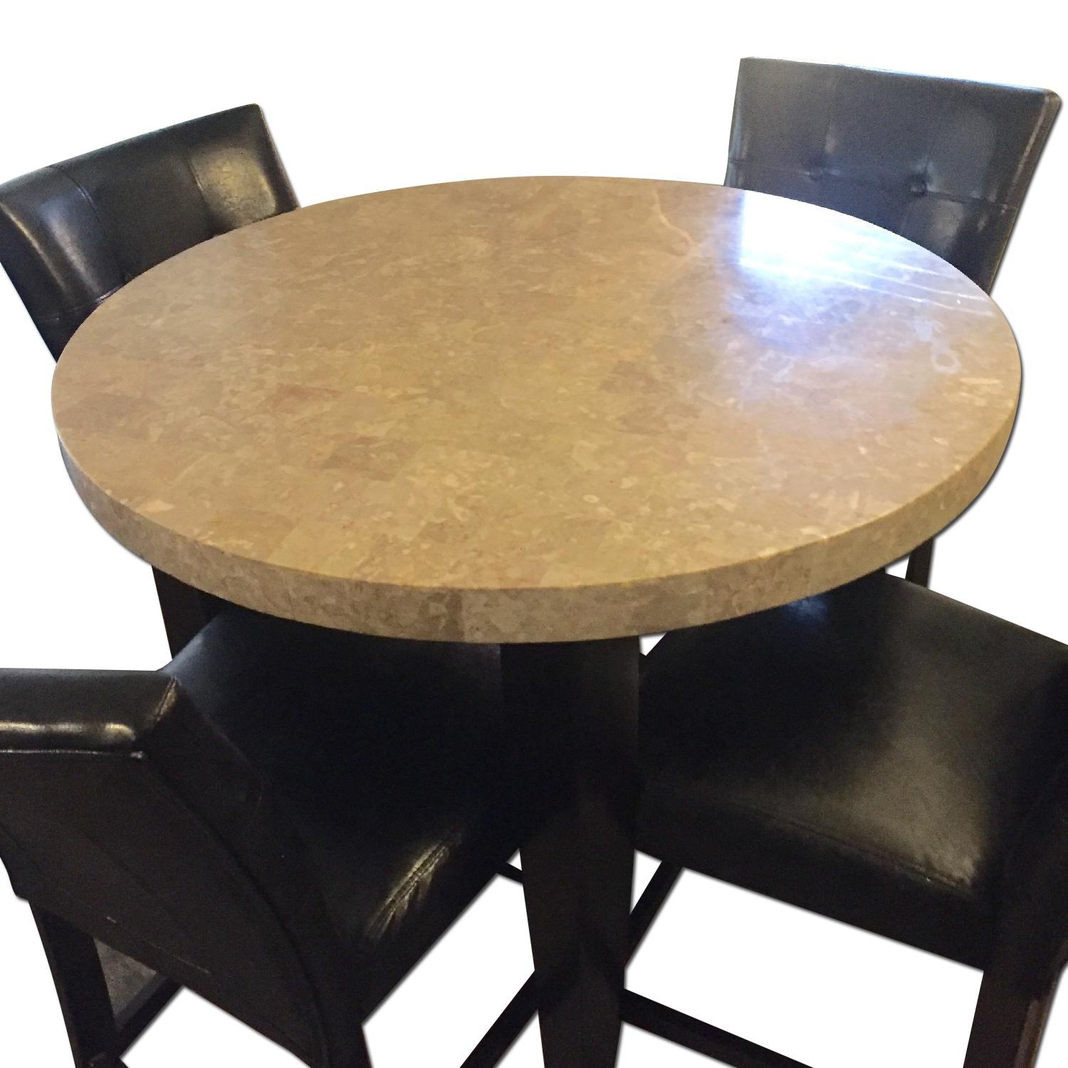 Seller's Notes:Purchased from Room Place 1 year ago. Marble top with wood black legs and 4 black leather chairs.Matches large 7 piece dining set that is also for sale.