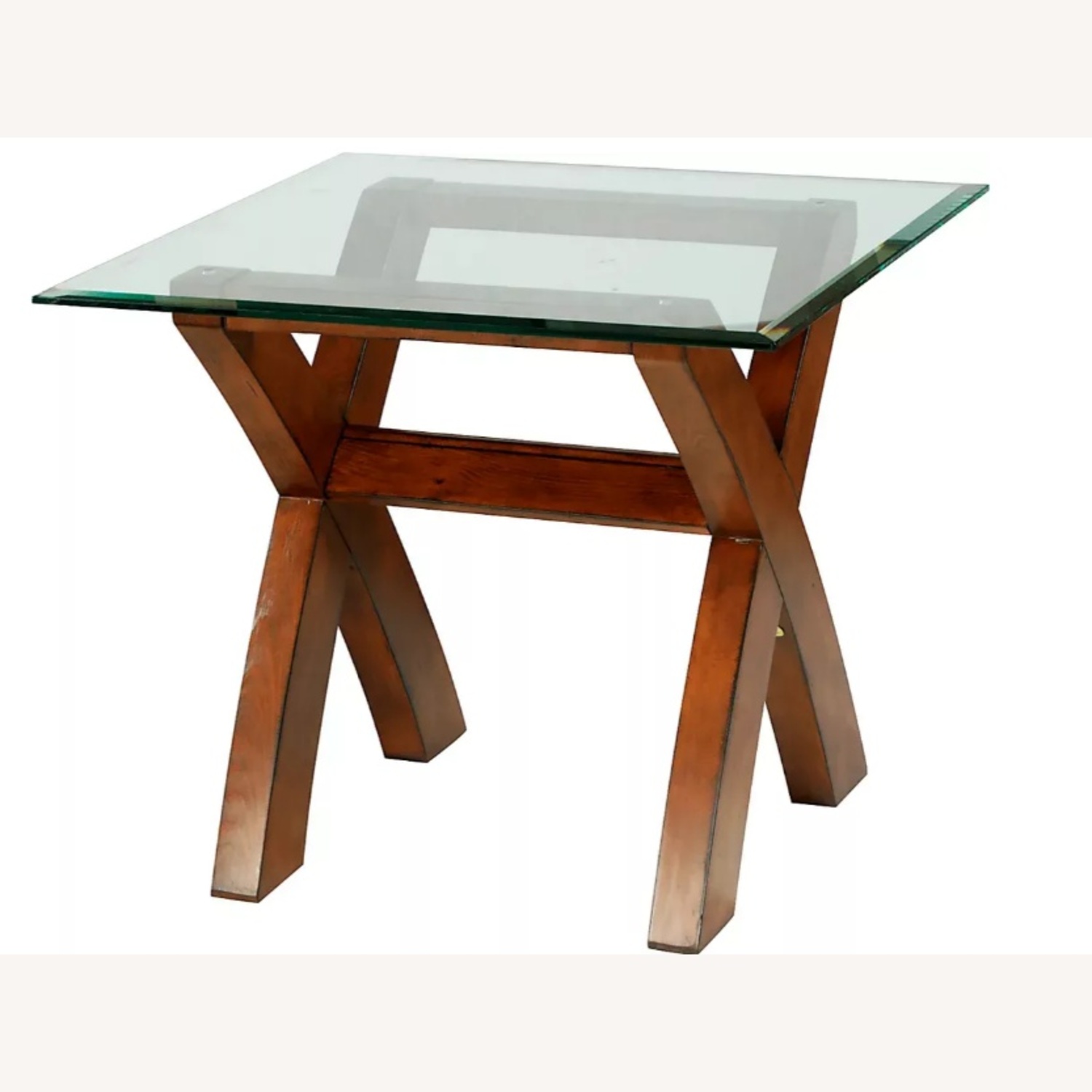 Seller's Notes:This attractive end table features a beveled edge glass top placed on a unique cross pattern base. The hardwood base has a wonderful burnished finish. The ideal complement to contemporary décor, the table has a fresh, contemporary look. Partial assembly required.