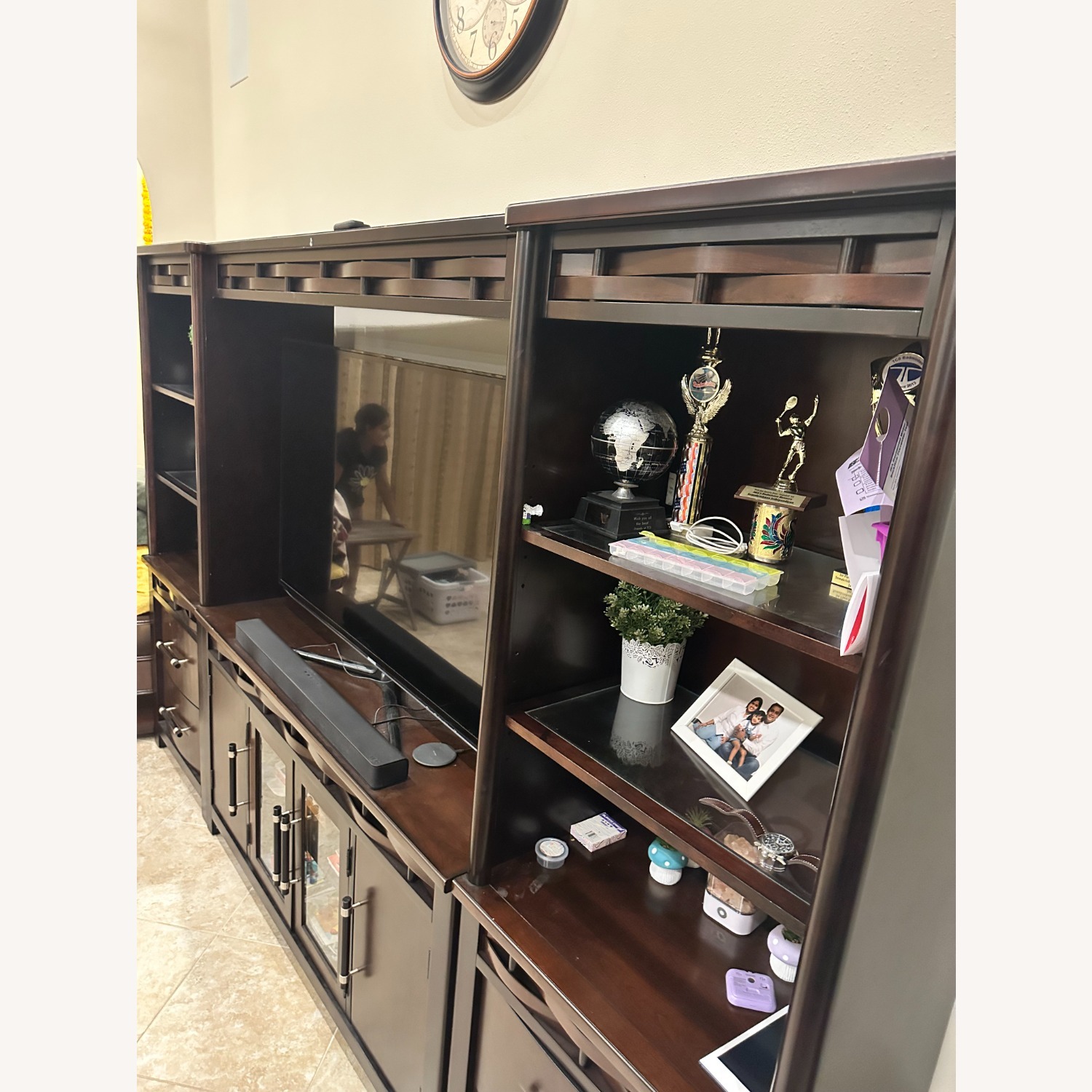 The clean design of the Bedford Heights wall unit enhances any space. Constructed of hardwood solids and cherry veneers, the rich two-tone cherry and espresso finish adds warmth. A semi-slat panel creates wonderful eye appeal, while four drawers and four drawers (including three adjustable shelves behind the doors) increases storage. Six open compartments offer additional storage or display potential. Large wooden dowel handles with brushed nickel accented hardware completes the overall transitional appeal of the piece.