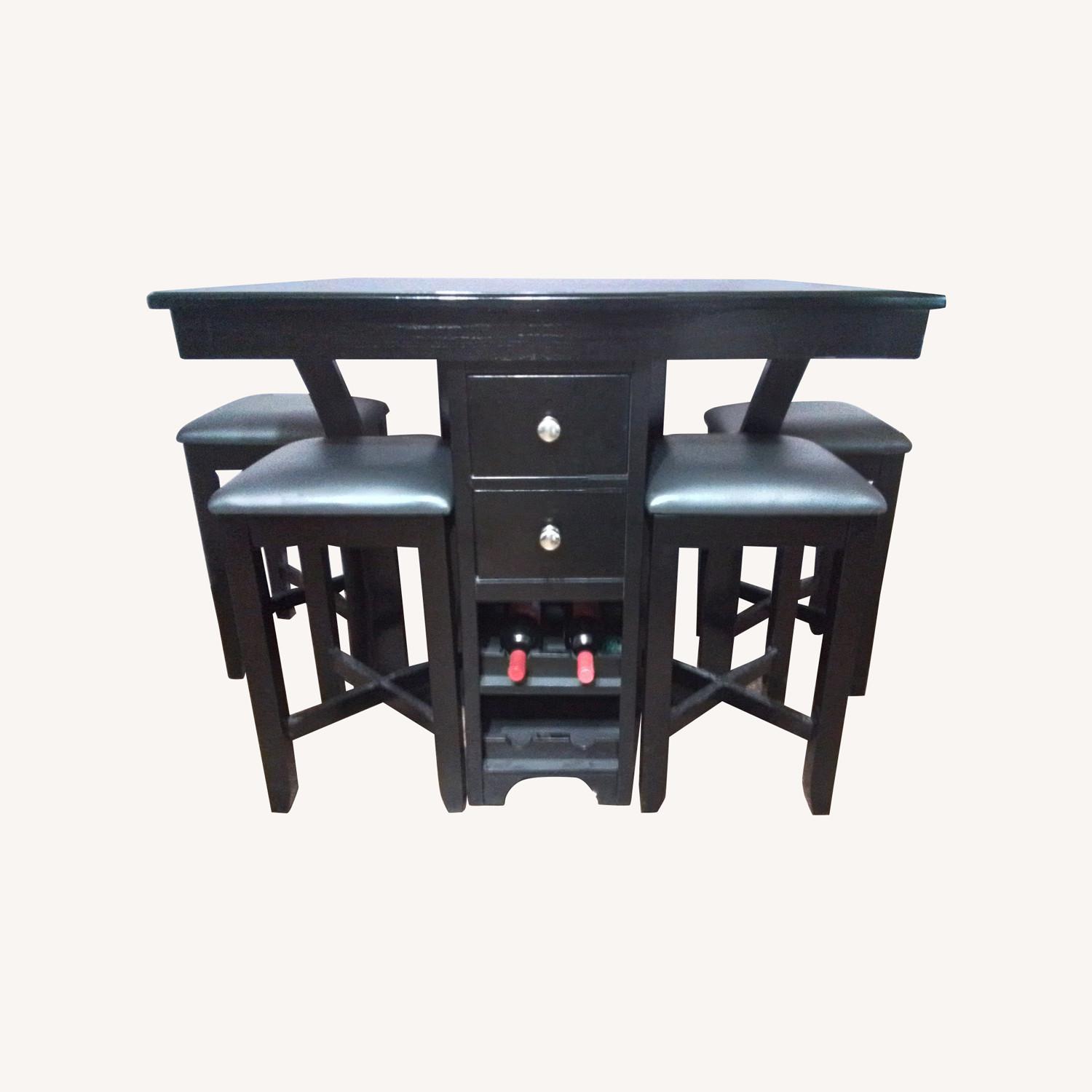 Seller's Notes:Beautiful, sleek, black dining set with drawers and wine racks on either side of wooden table. Space-saving design with cushioned stools that tuck under the table perfectly. Bought this for my apartment a few years ago, it hasn't had much use (I usually eat out, and live alone).