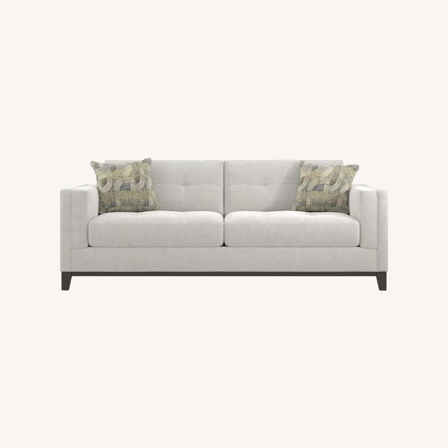 Blending supreme comfort with versatile transitional style, the Everleigh Place sofa from Cindy Crawford Home is a wonderful choice. Upholstered in a plush chenille fabric, this piece comes in an oyster beige color that is pleasing to the eye. Featuring padded track arms and an espresso-finished wood base, this sofa is great for those looking to make a statement with their space. 100% Polyester.