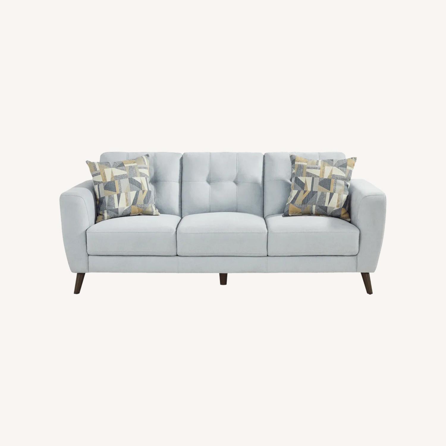 Seller's Notes:Bring a vibrant and upbeat feel to the everyday with the soft hues and casual design of the Claremont Heights sofa. Upholstered in a woven fabric, this contemporary piece features a padded outside frame with stylish flair arms for a relaxed feel, while button-tufted back cushions provide a touch of uptown class. Tall, tapered legs accentuate the soft blue upholstery while the attached seat and back cushions offer an added hint of luxury. Upholstery: 100% Polyester.