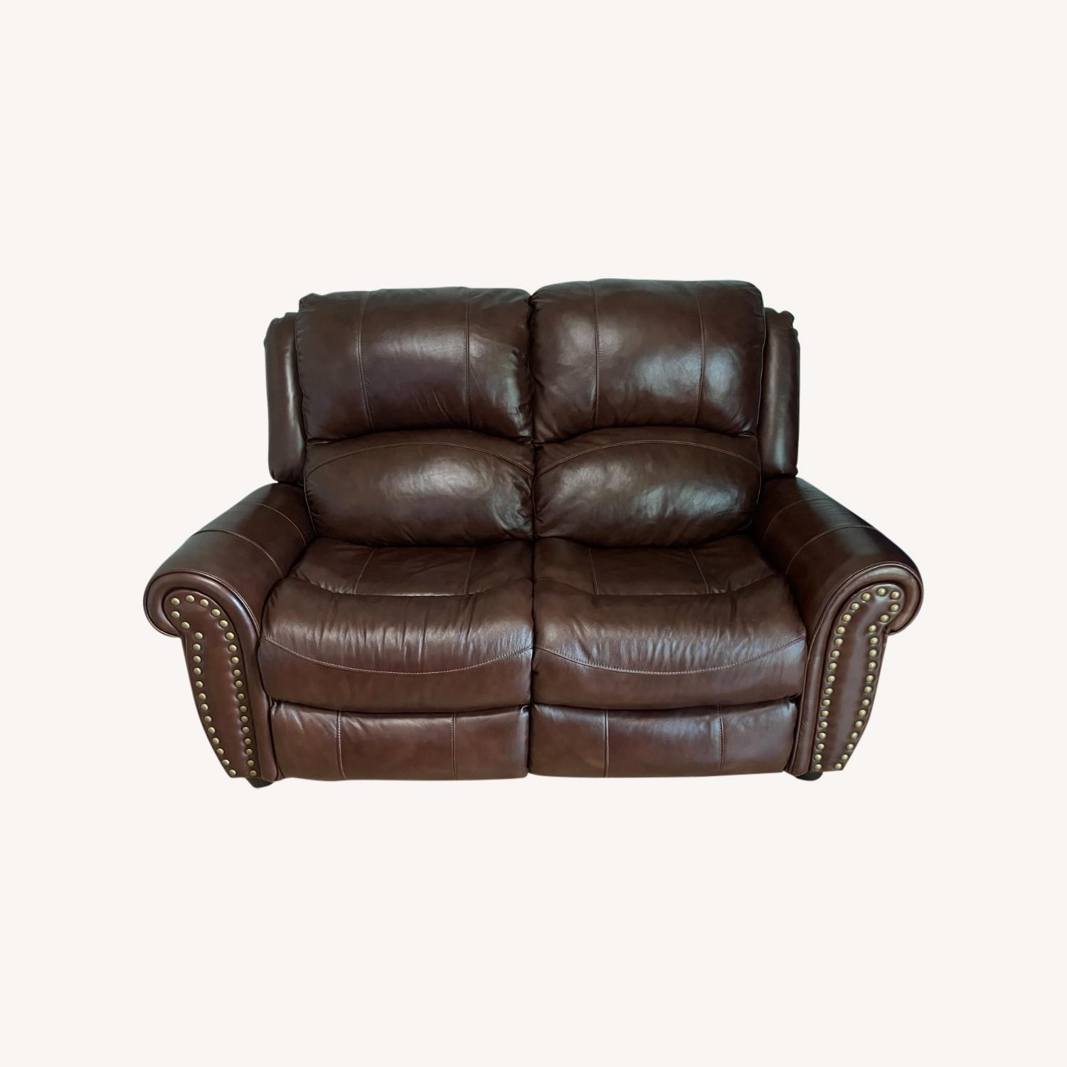 Seller's Notes:This loveseat has arm rests with gold colored metal studs for a classic and unique look. It had been in a home without children or pets, so it has little wear. It was purchased and put into a secondary room when consolidating apartments, so rarely used and in great shape. It is 68” long 39” deep and 47” tall. The arm rests are 25” from the floor. The seat is 20” deep and 20” from the floor. It is easy to move as the back rests are detachable making it much lighter and more movable for tighter areas in the house (aka corner and stairs).