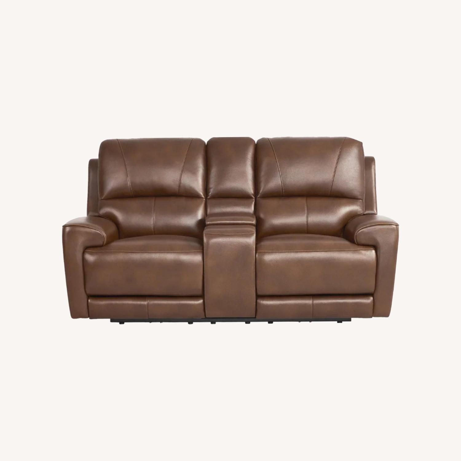 Aristocratic and easily contemporary while boasting a sophisticated timeless silhouette, the Drew and Jonathan Fremont dual power console loveseat infuses every room with the nostalgic comfort of a well-used library and the warm embrace of shared familial memories. Traditional in style, this piece features brown top grain leather where the body touches made even more relaxing by a single attached cushion and sumptuously padded arms. Contrast welting provides stunning visual details, and cupholders and a console box can be easily removed to adapt to your own personal relaxation style. Dual power includes a power adjustable headrest and extended footrest for extra support and leisure. Zero gravity reclining adds the final touch for the ultimate experience in recliner comfort while its control panel includes USB-C and USB-A charging ports to keep your electronics close at hand and at the ready. Upholstery: Top grain leather where the body touches and polyurethane fabric sides and backs. Leather is a durable, low maintenance product; however, general regular maintenance is necessary. To keep your leather clean, vacuum it regularly, removing any dust, and clean it with water and a mild non-detergent soap.