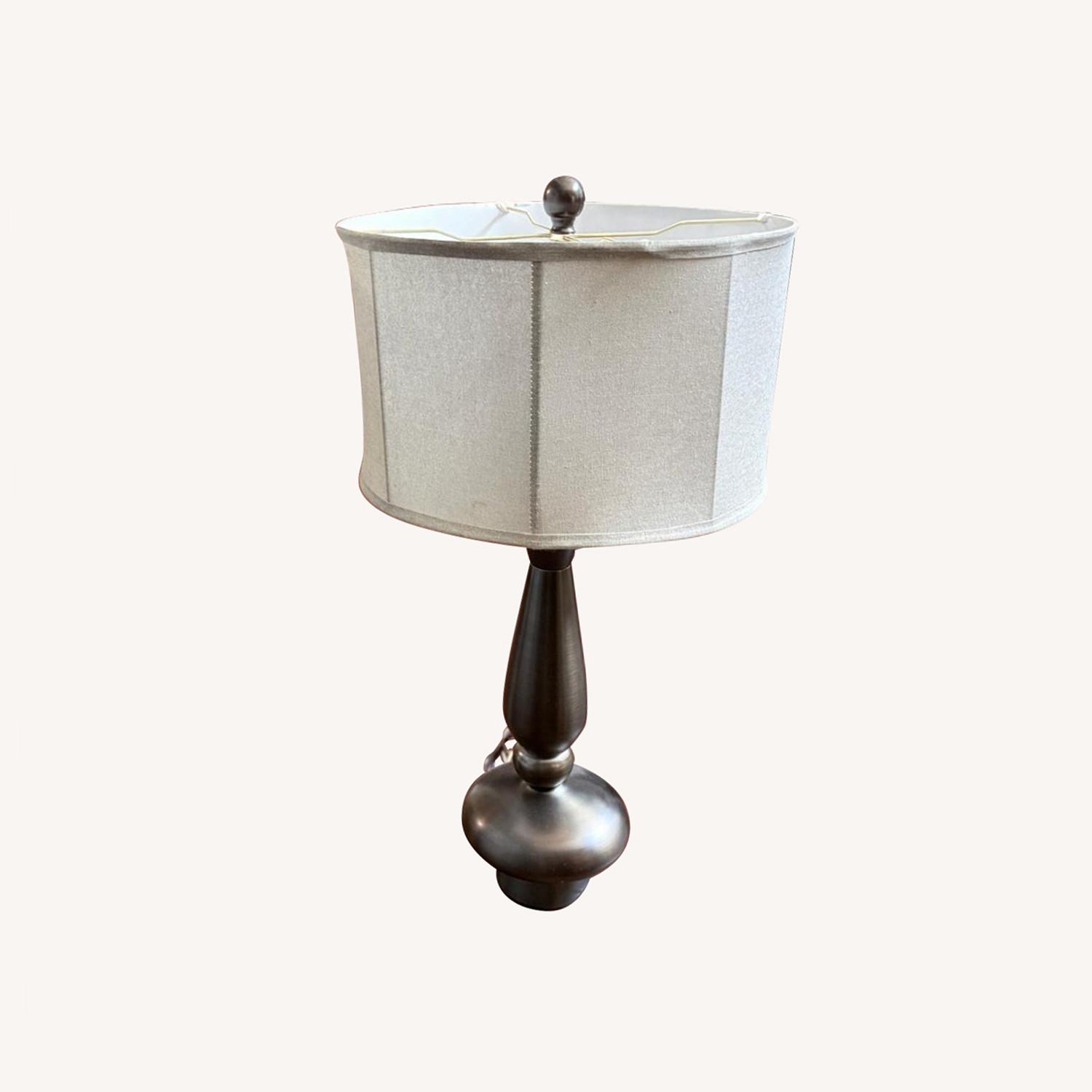 Seller's Notes:A unique shape and copper-bronze finish give the Dunbrook table lamp a contemporary spin. The linen color drum shade adds just the right finishing touch.