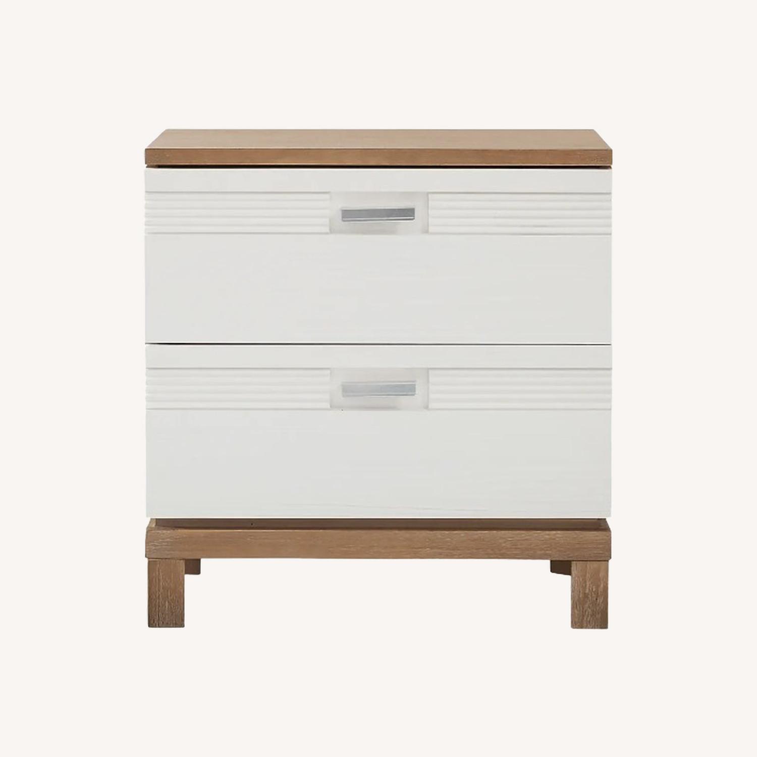The Gardenia nightstand not only boasts a chic contemporary style, but it also includes thoughtful details designed to make your life easier. Crafted of pine solids with a two-tone brushed pecan and white water-based finish, a convenient storage tray with dual cupholders in the top drawer instantly expands the surface space to keep everything you need right at hand. Lead-free aluminum hardware adorns the two drawers, each utilizing strength-enhancing French dovetail construction, emphasizing the sleek modern style of this brilliant piece.