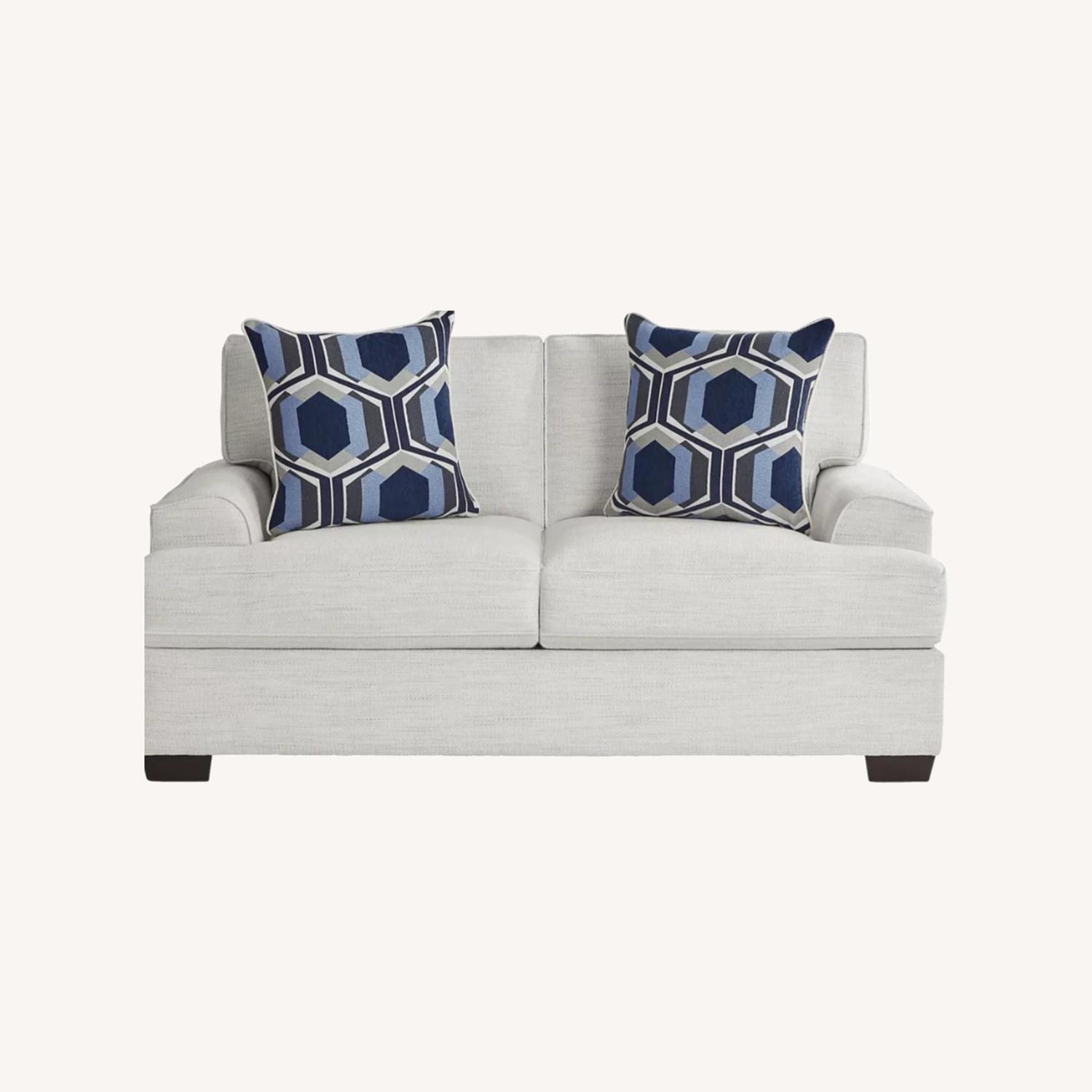 With a refreshingly bright and laid-back style, The Hutchinson loveseat enhances every moment of quality time spent with family & friends. This contemporary seat features relaxed woven upholstery in a light cream color that dazzles. Details like welted seams and tapered block legs bring subtle visual appeal, while the low-profile track arms and reversible seat and back cushions offer functionality as well as style. Complementing and enhancing the airy look, two accent pillows add a splash of color. Upholstery: 100% Polyester.