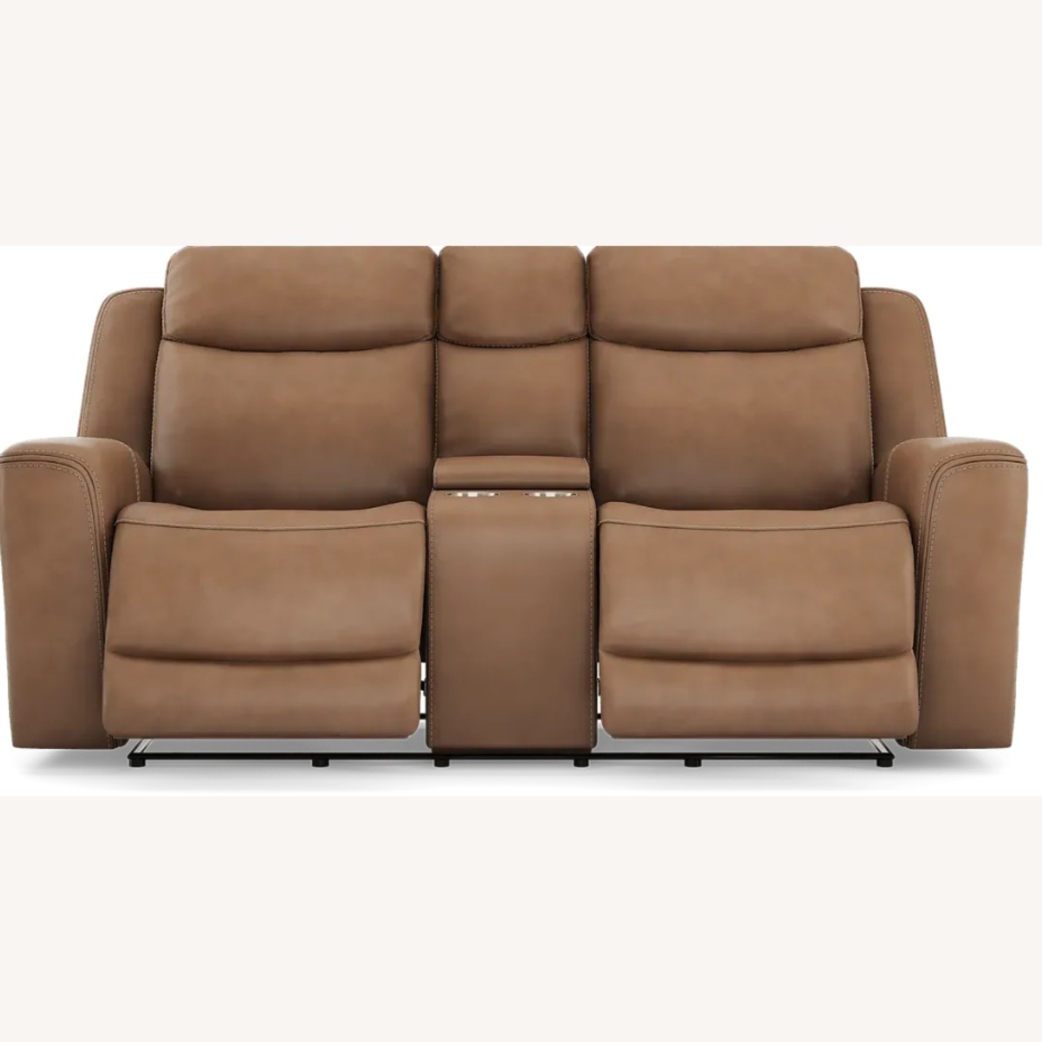 Sleek lines, luxurious comfort, and casual artistry meld into the space-defining appeal of the Drew & Jonathan Davidson loveseat. A transitional spin on a family favorite, this piece is upholstered in caramel top grain leather where the body touches. Top-stitched seams stand out on every curve and exaggerated slope, while tight, angular structural details on the arms and back maintain a strong outline when viewed from anywhere in the room. The track arms roll inward to deep, curved seats that cradle guests in luxurious comfort. Dual power reclining takes relaxation to the next level and includes adjustable headrests and footrests, with USB power on the control panel for easy charging and custom comfort. This loveseat also features a convenient center console with cupholders and hidden storage. Upholstery: Top grain leather where the body touches and polyurethane sides and backs.