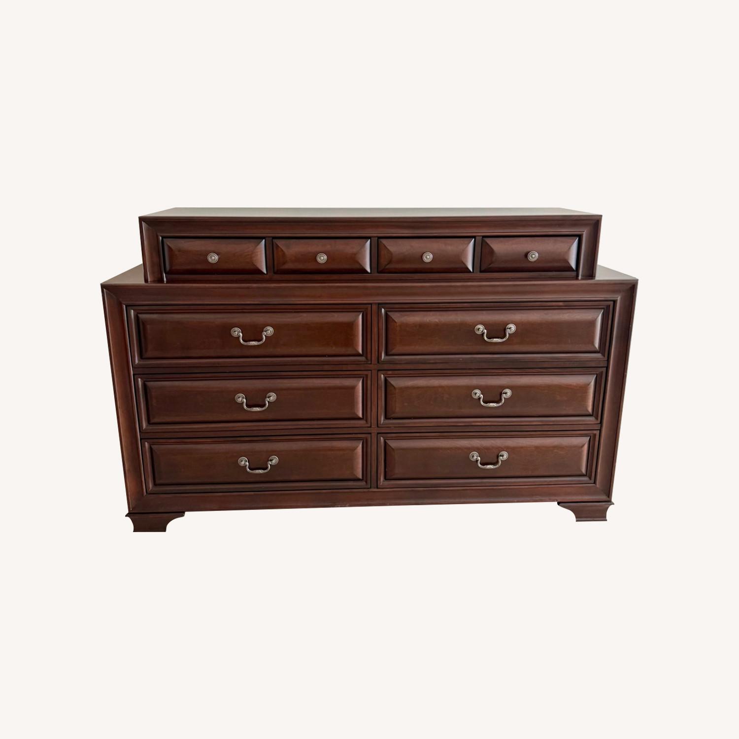 Seller's Notes:65"w x 17"d x 42" Storage is so stylish with the Mill Valley dresser. Comprised of pine solids and birch veneers then finished in cherry, this piece features simple, clean lines for sophistication and ten generously appointed drawers for storage needs. To bring out the beauty, it is accented with antique silver finished hardware while English and French dovetail construction provide stability for years to come. With a felt-lined top drawer and dust-proof bottom, this is a haute place for your greatest garments.