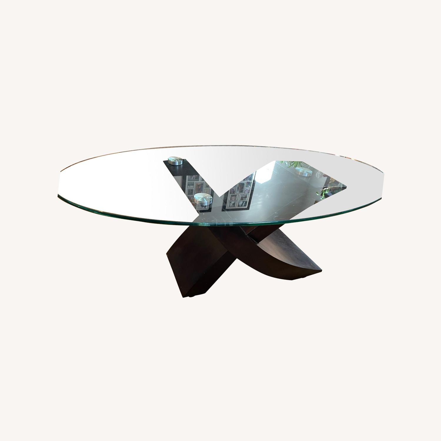 Seller's Notes:Glass topped dark wood coffee table. Unique design and thick glass with a rounded edge so minimal risk of breakage or injury.