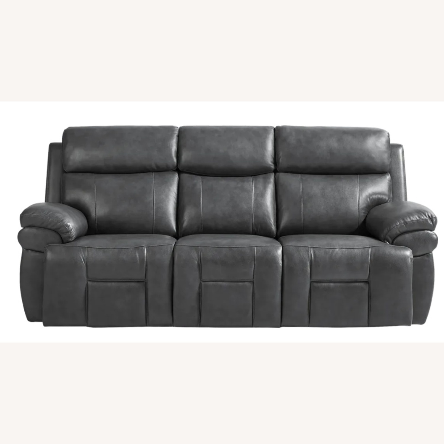 Designed with luxury in mind, the Morisano reclining sofa brings the gift of comfort to your home. Upholstered in gray top grain leather where the body touches, this sofa offers a cushiony feel you're bound to love. Plush pillowtop arms and padded chaise footrests make this piece an ideal spot for watching television or curling up with a good book. For ultimate relaxation, its triple power reclining function gives you the ability to adjust your headrests, footrests and lumbar supports at the touch of a button. Heated seating, air massage and zero gravity capabilities enhance your comfort. Fitting perfectly in the side pocket, the handheld remote includes a built-in USB port to conveniently charge your devices. Top grain leather where the body touches with vinyl sides and backs.