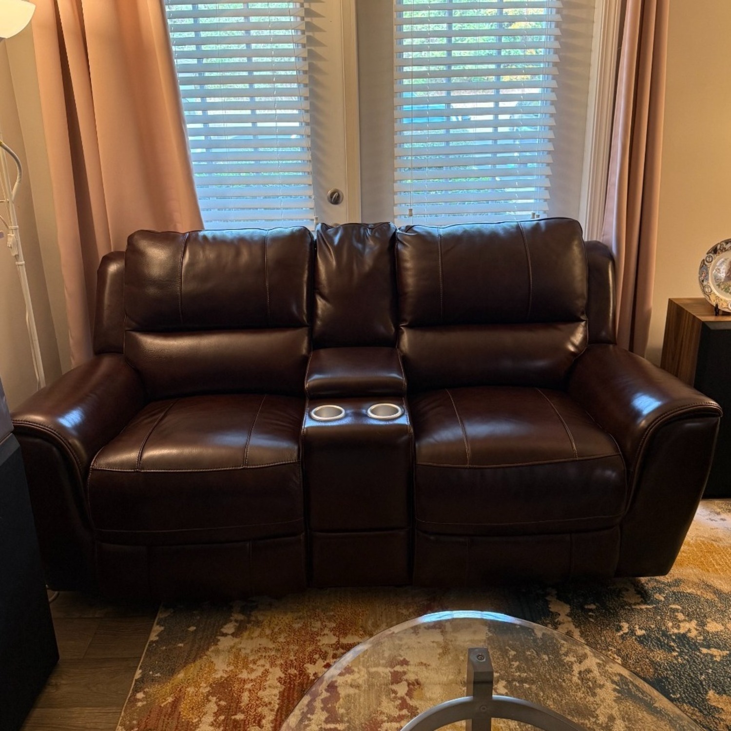 Seller's Notes:This stylish and comfortable power reclining loveseat is perfect for relaxing at home. It features: Dual Recliners: Both seats recline at the touch of a button for customizable comfort. High-Quality Upholstery: Covered in durable, easy-to-clean faux leather in a dark brown color that complements any décor. Built-in Features: Includes USB charging ports and cup holders. Compact Size: Ideal for living rooms, home theaters, or smaller spaces. In excellent condition, from a smoke-free, pet-free home.
