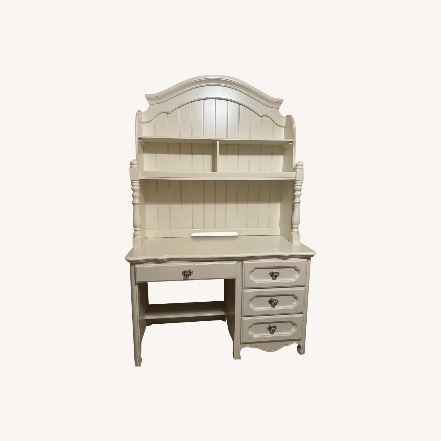 Seller's Notes:Well-loved computer desk - has normal wear & tear (stains/marks and 1 crack on the table) from daily use. Retail description: When she's ready to study, the Adrian computer desk and hutch can be the ideal headquarters. The hutch has attractive paneling and abundant storage space with shelves that are perfect for books and displaying pictures of her friends. The desk has three drawers and a pull out tray that hides a computer keyboard.