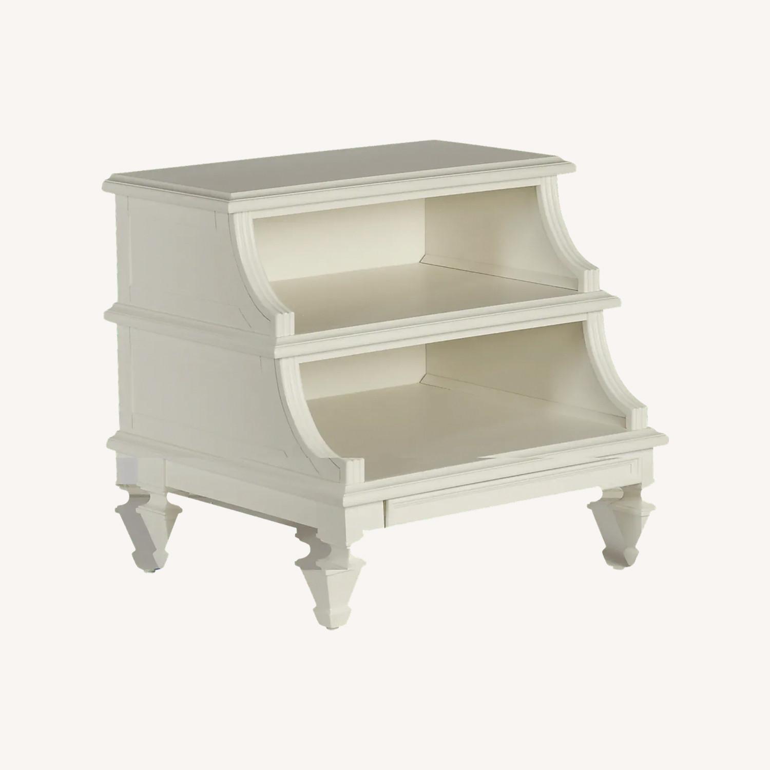 Charmingly designed to brighten up any space, the Belmar step nightstand makes an excellent bedside companion. Constructed of hardwood solids and veneers with a bold white painted finish, slightly scalloped sides create an attractive and eye-pleasing profile. Two open shelves and a lower drawer make storing pictures, magazines, books, and any number of things not only simple, but perfectly within reach.