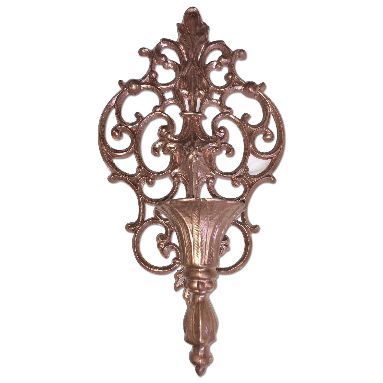 Seller's Notes:A pair of beautiful Rococo-inspired vintage wall sconces from the 1970s in practically perfect condition - there are only tiny, unnoticeable spots of discoloration (see in the photos they are not even discernible). Made from rose-gold toned metal with absolutely minimal wear and tear, they look brand new. They hang easily with nail holders on the back. They are artfully crafted to hold candles and add a romantic vibe to any room. Sold as a pair.