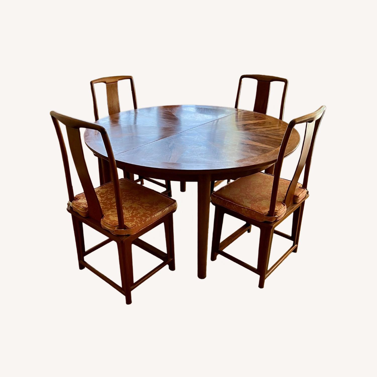 Seller's Notes:My parents have moved into a smaller apartment recently. This Rosewood dining set with 2 leaves and 8 matching chairs with original cushions will not fit, and we have no place for it in our family. This dining set was brought back from Hong Kong in 1958 by my grandmother and grandfather. At the time, my grandfather was an Economics professor at Cal, and he had been asked by the newly federated Indonesian government to help them design and implement a ‘national economy.’ My grandparents picked this up with a number of other treasures on their travels, which included Hong Kong and China (Shanghai + Peking). The pictures show the dining set with one leaf and 6 chairs and without leaves in 4 seat configuration. It's all in very good condition and super beautiful.