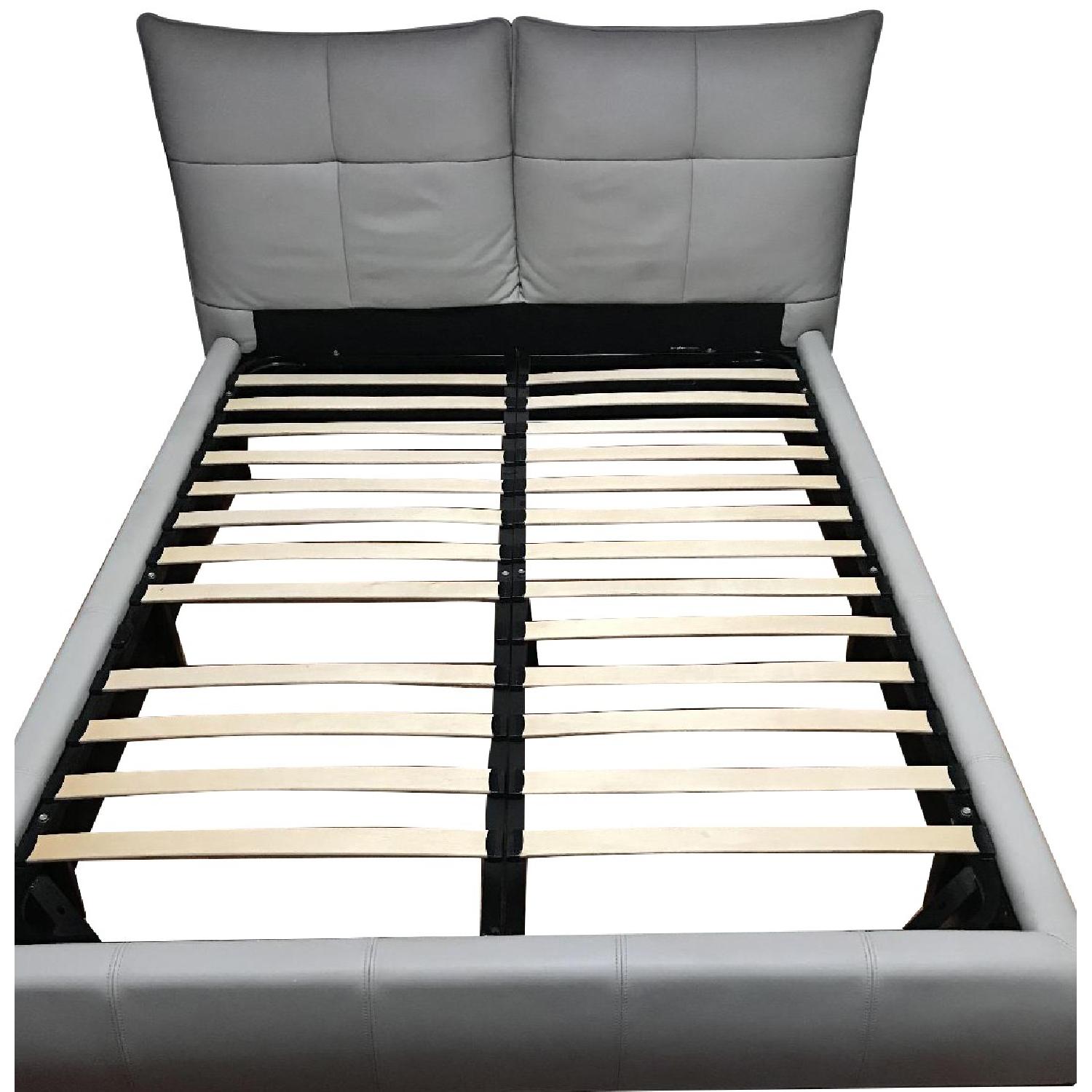 Seller's Notes:Queen size, thick top grain full leather platform bed with split headboard in light grey. Split-back tufted headboard panel with knife-edge corners.