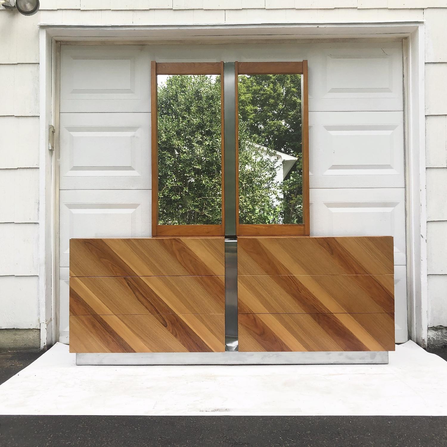 Seller's Notes:This stylish burl wood and steel finish dresser with matching mirror make a striking mid-century modern addition to any bedroom. Offering the perfect mix of style and storage the versatility and impressive design make this piece special. By Rougier of Canada the vintage modern mix of rich wood grain and polished steel trim will make your bedroom set pop! Matching Armoire Dresser and King Headboard with Built-in Nightstands also available- Dimensions: 74w 20d 29.5h Condition: age appropriate wear, some scuffs/dings/edge wear, metal trim bent/loose at bottom center edge, see photos.