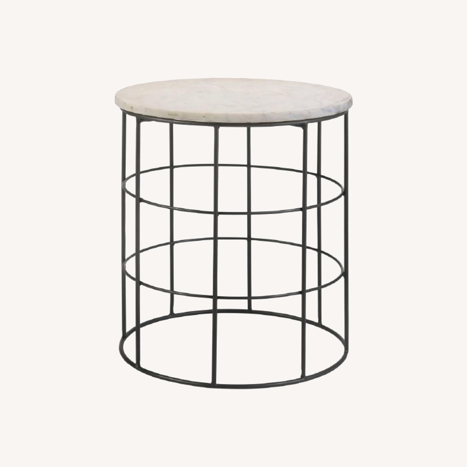 Seller's Notes:A cage-like base offers an open, airy aesthetic to this modern accent table. Designed with a round drum shape, this accent table offers a white marble tabletop. Resting on a geometric base with a grid-like design and slim rod supports, this accent table lends itself to a variety of color palettes. Keep it beside a club chair for a place to rest a cocktail or beside a sleeper sofa, allowing it to double as a nightstand for overnight guests. It can even be used as a plant stand for special greenery.