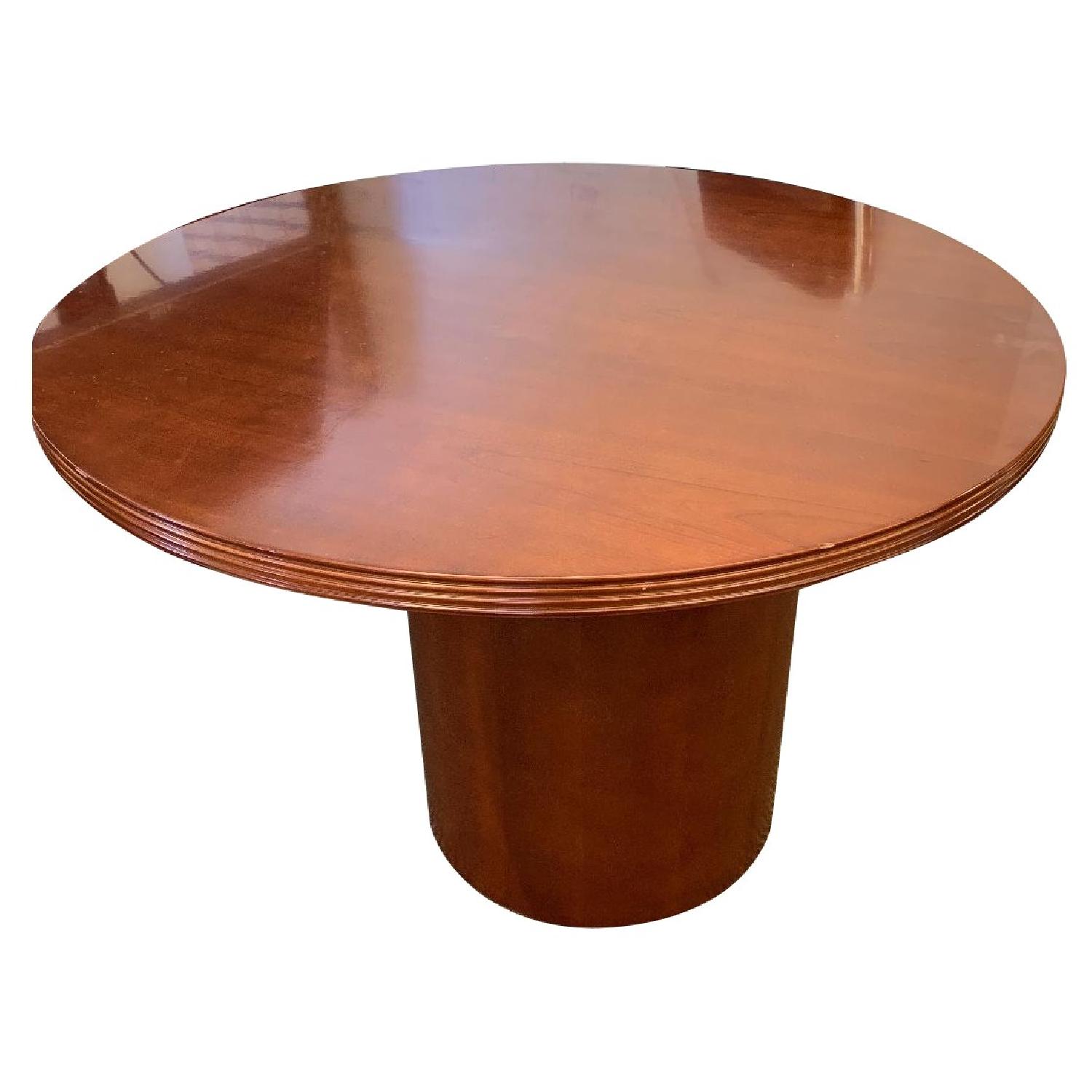 Seller's Notes:A slightly used conference table that's taking up space in our office, this cherry wood round table measures 42" in diameter, and would be a great addition for any professional setting. Full disclosure, does have a few dings on the outer rim, which I did my best to document with my pictures. Please let me know if you have any questions or concerns, thank you!
