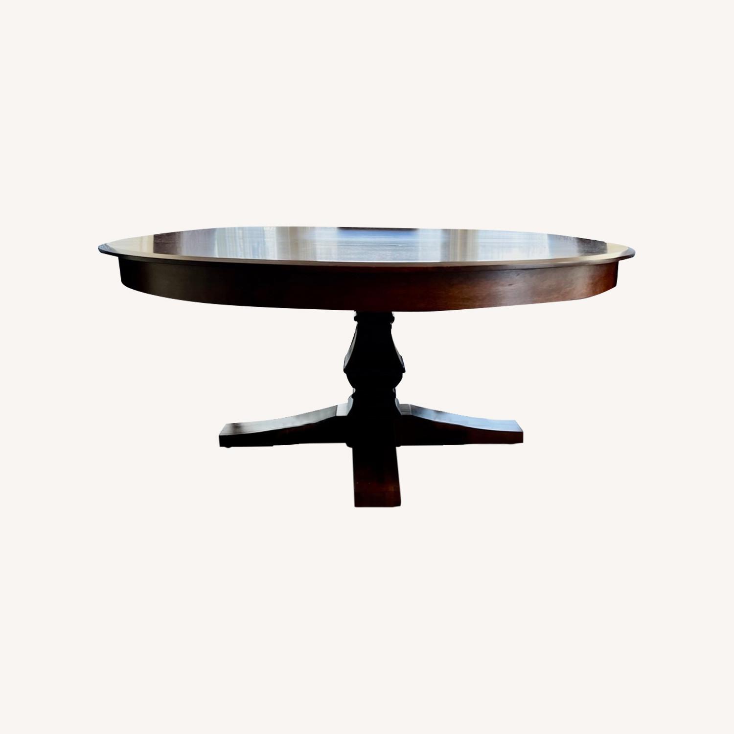 Seller's Notes:We purchased this table (and chairs) in 2019 for our new home, and after renovating the kitchen we no longer want this style (simply an aesthetic change). This table comfortably seats 6-8 extended (79" DEPTH), 4-6 without the leaf (59" DEPTH). The wood all around is in excellent condition. The middle of the table, on the leaf extender, has slight scratches (as seen in the picture) which is from a decorative tray. The scratches are very hard to notice and can easily be buffed out with the right cleaner. The center of the table is a beautiful trestle, looks very similar to the Trestle Round Dining Table at RH: https://rh.com/catalog/product/product.jsp?productId=prod15970044&layout=horizontal