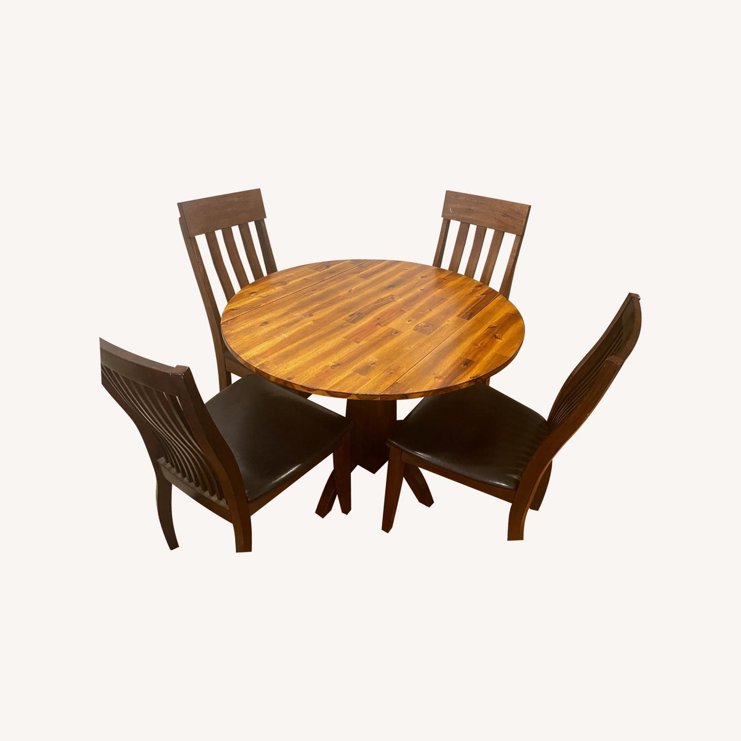 In good condition with some surface tarnishing. Circular table made from solid wood. Two side panels fold down. Super sturdy. Came with two chairs and we added two of similar style. Two different style chairs with two chairs of each style. See photos for the two styles.