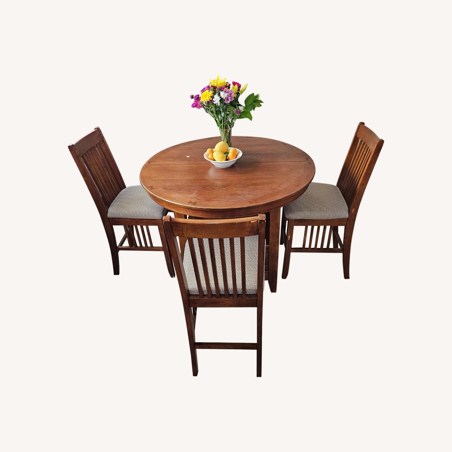 Seller's Notes:Round extendable dining table with 3 chairs. Built-in butterfly leaf extends the round 47in to 65in oval length. Scratches throughout, identified in photos. 3 chairs measure 44.5" h (25" seat height) x 18" d x 18" w Table measures 36" h x 47" x 47"-65" Storage beneath!