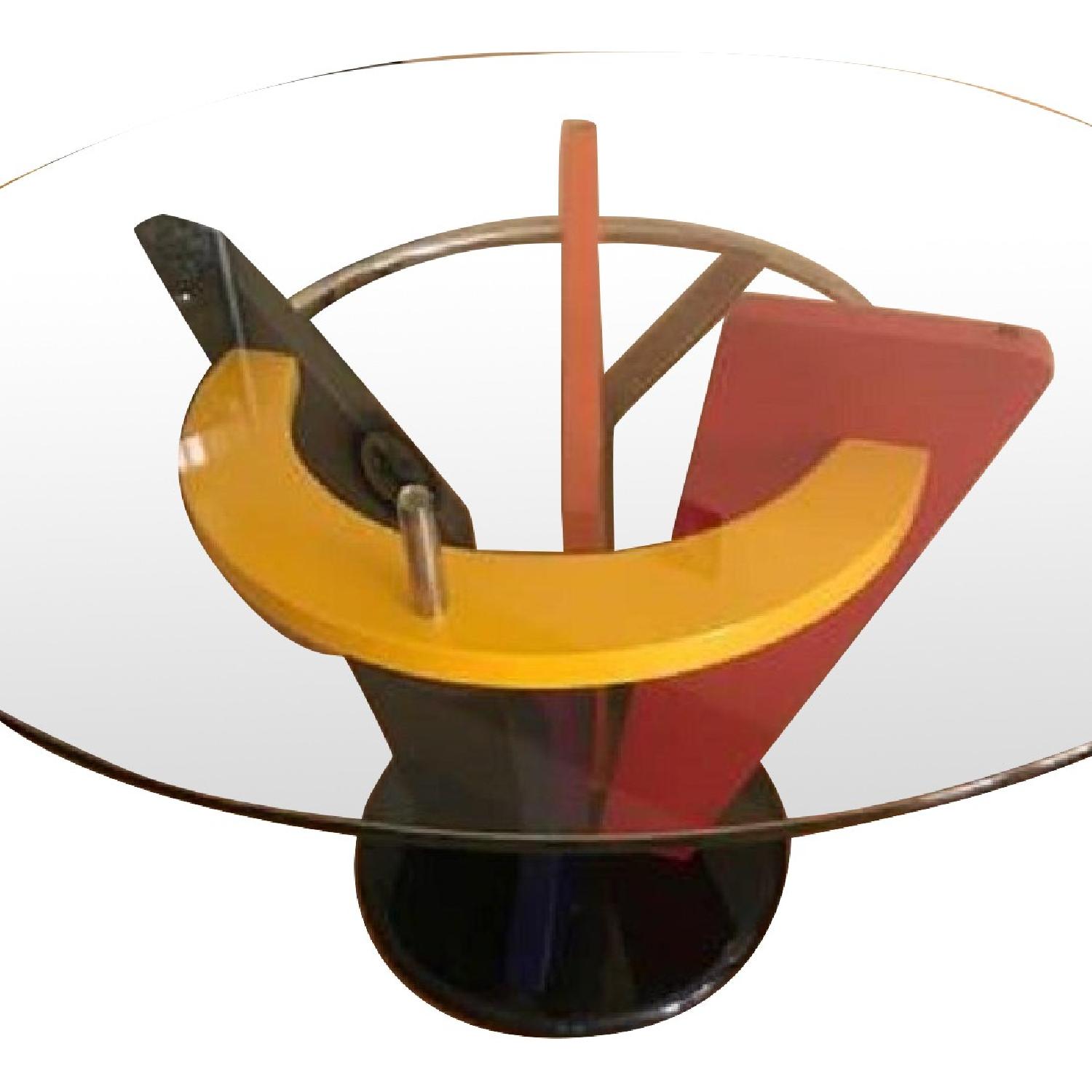 Seller's Notes:The 5-piece wood and glass dining table with 4 leather chairs set will enhance any eating area. This table draws the eye with its multi-color wood frame has a unique round stone pedestal base, while a circular top of tempered glass is the definition of upscale elegance. Four faux leather upholstered side chairs sitting all around make it even more marvelous, also offering space to have a seat with company for good conversation and even better food. This set comes with four chairs - 2 yellow and 2 blue with a rust resistant finish and can help you to create an ideal dining setting that is both elegant and durable. These chairs are designed for easy maintenance and daily use. The round shape tempered glass top table has 47'' diameter. This dining set is very easy to assemble. It's in great condition with no visible scratches and was almost not used. You will love it! No returns accepted. Local pick up only.