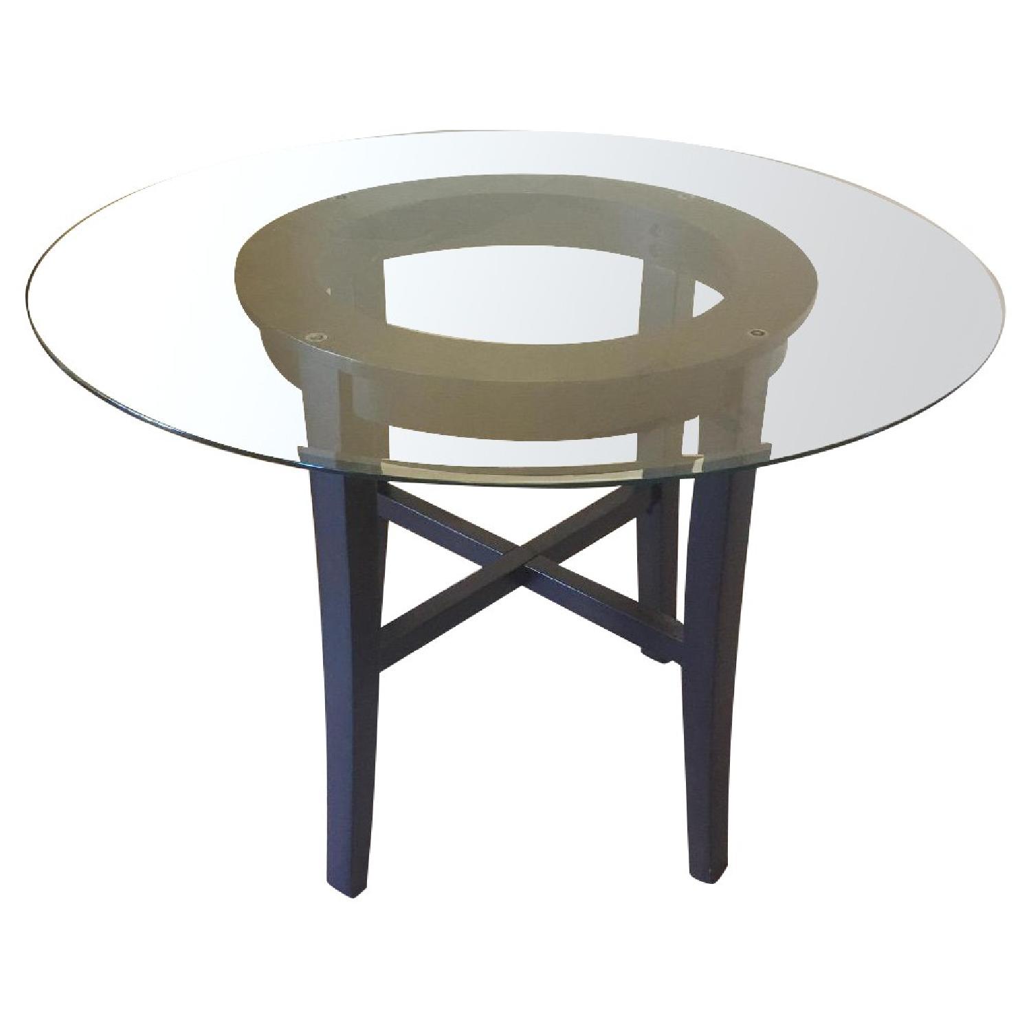 Seller's Notes:Great condition circular glass top, wood frame kitchen table. Getting a new kitchen table so this one needs to go. There are a couple minor scuffs from having been moved a couple times but overall the table is in great condition and is an excellent addition to any home!