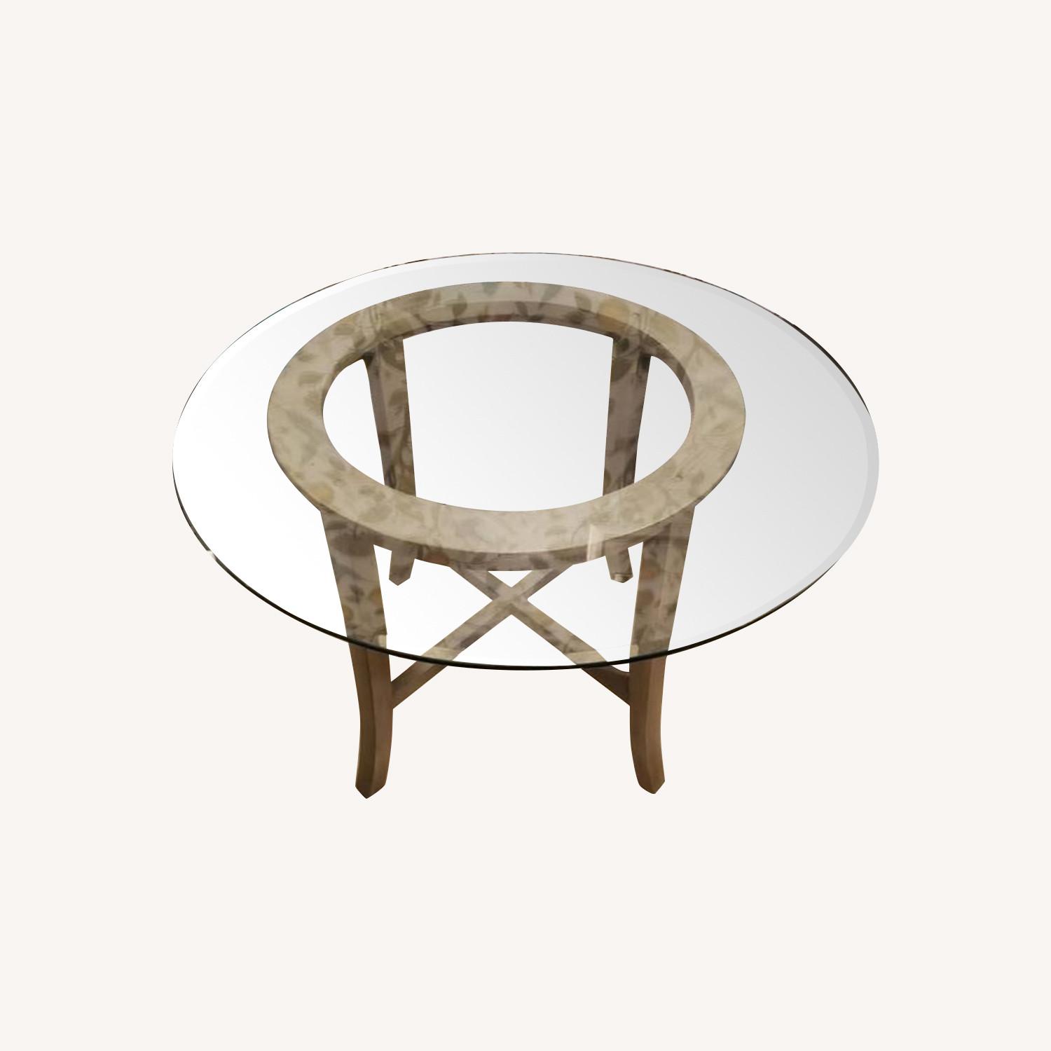 Seller's Notes:Very nice clean round table, top glass, 42 inches in diameter. The base as a small crack as seen on picture, but with no impact on the table itself.