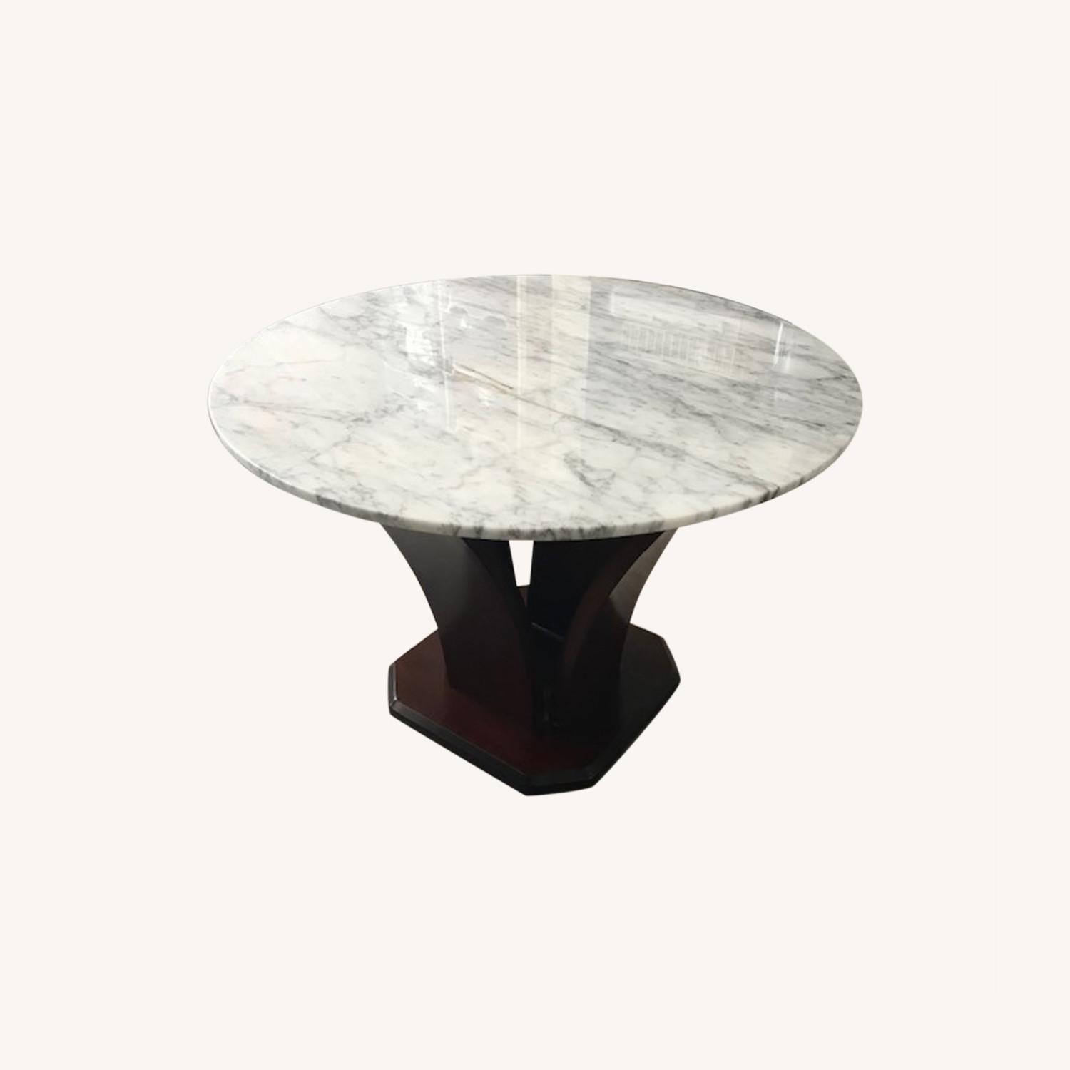 Seller's Notes:Beautiful round white with grey grains marble. Size: 43" diameter. Wood table base type - pedestal. It has 1 shelf. Very solid and practical dining table.