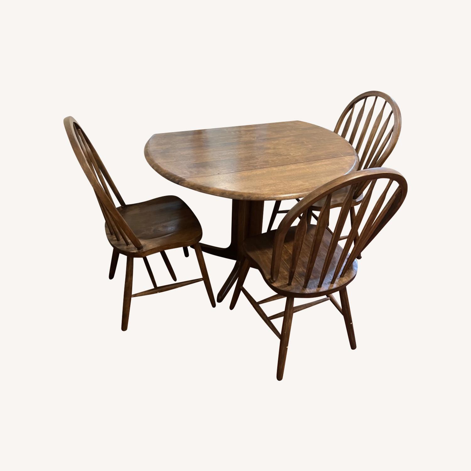 Seller's Notes:Inherited from a cousin, this solid wood round table has a long life ahead. With both leaves dropped, the tabletop measures 40” x 21”. Two of the chairs match while one is a slightly larger one and the same style. Open to offers, needs a new home by July 30.
