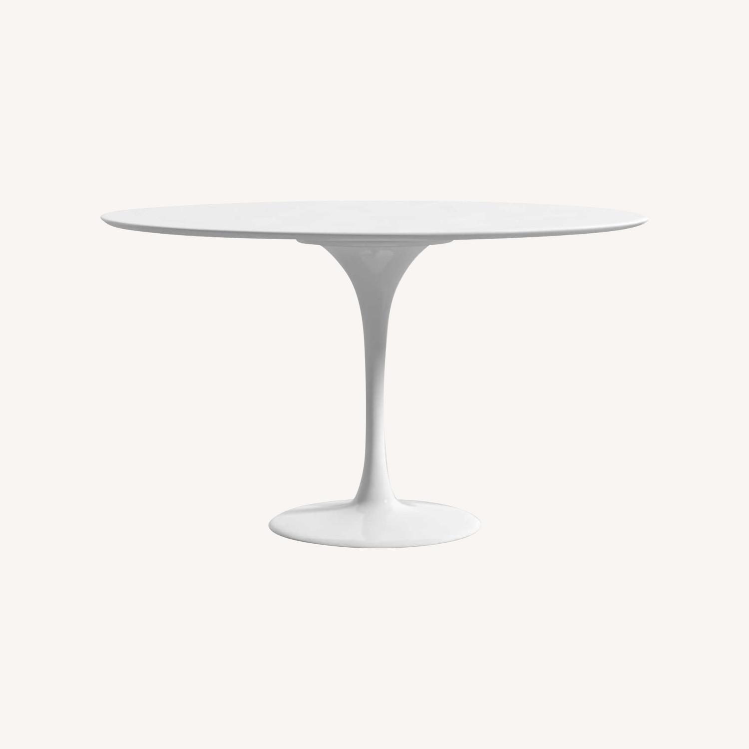 Seller's Notes:The Tulip Table series is a premium reproduction line inspired by Finnish and American mid-century architecture, a period vastly characterised by the simplification of everyday living. The unique single pedestal base is made from strong cast aluminum to support a heavy top whilst eliminating the unnecessary clutter of legs underneath.