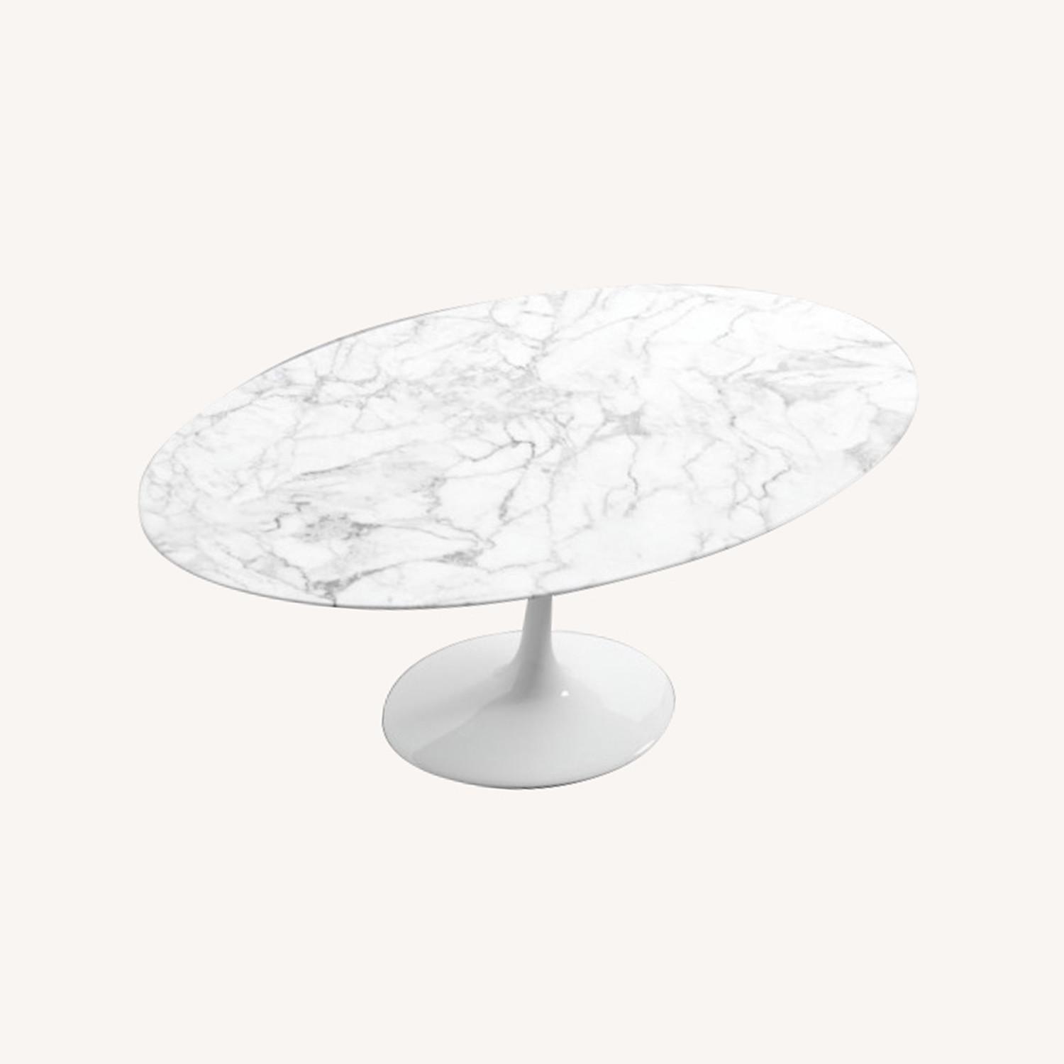 Seller's Notes:Carrera Marble Saarinen style Tulip Table purchased from Rove Concepts less than two years ago. Originally purchased for $3,800. This timeless table is from a premium reproduction line and has a Carrera marble top and white glossy base made from strong cast aluminum. This table is truly the best reproduction you can find and is always on backorder. Dimensions are 79" long x 28.75" high x 47.5" across. There are a couple very small imperfectios on the base and marble that you can see in the pictures, but other than that the table is in near perfect condition.