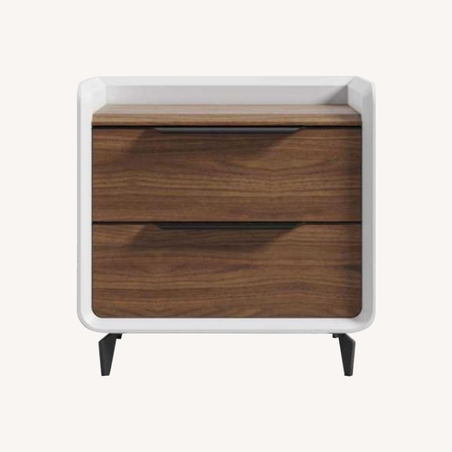 Seller's Notes:Grayson's modern facade is attributed to the striking contrast of glossy white and rich walnut veneer combined with round curvatures and sharp industrial lines. As if arriving from the future, the sustainably crafted and sturdy materials are destined to last for years to come. Easy open-and-close drawers are matched with sleek aluminum handles. The indented top is a good place for extra storage without the worry of items falling off. Comes with optional legs.