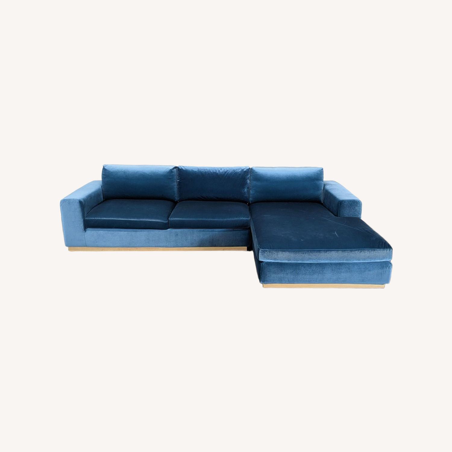 Seller's Notes:This sectional from Rove Concepts features a rich blue velvet fabric and a sleek light wood base. The modern design offers plenty of comfortable seating and a spacious chaise for relaxing. Perfect for any living room looking for a stylish, cozy upgrade. Excellent condition and ready for your home.