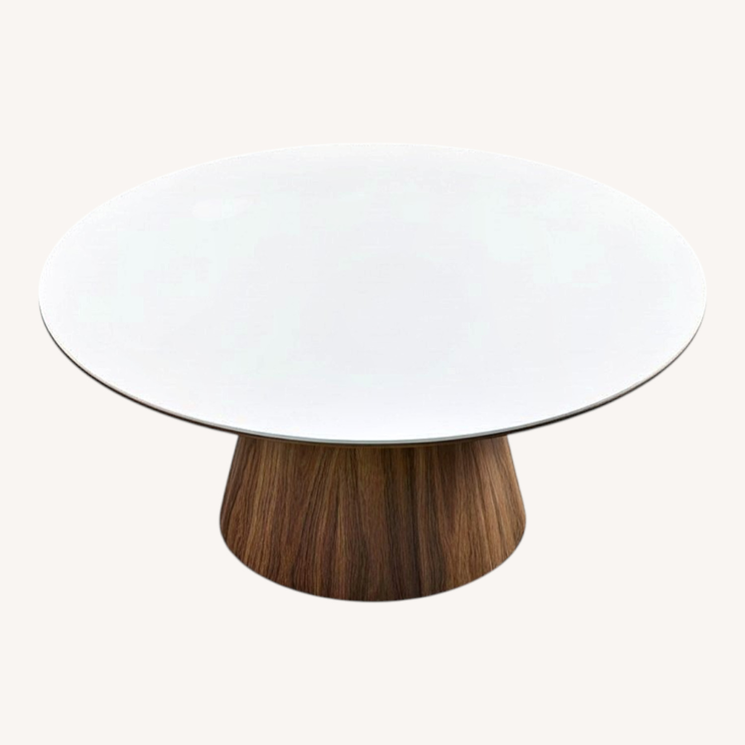 Seller's Notes:Rove concepts coffee table, only two years old and in excellent condition. There is only one small scratch on top (pictured) but its not noticeable. The Winston Coffee Table has a unique aesthetic, borrowing elements from both the mid-century modern style as well as from contemporary minimalism. Its intentional single pedestal base is uncluttered yet sophisticated in design with a clean Scandinavian inspired top. High gloss white lacquer with clear tempered glass top Smooth American walnut veneer Generously beveled edge Width of base is 17.7" Glass top is not removable