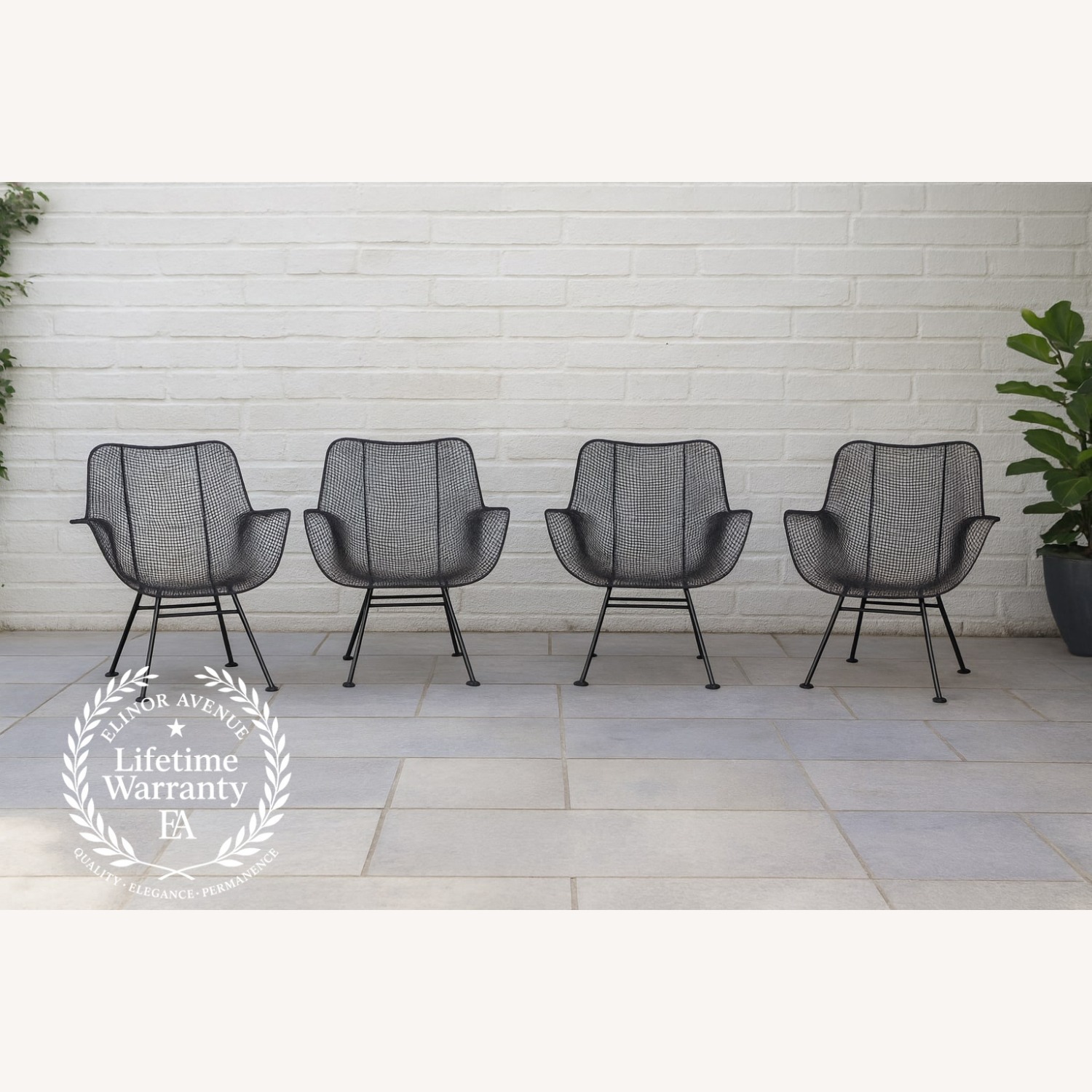 Seller's Notes:An exceptional matched set of four original Russell Woodard “Sculptura” lounge chairs, designed in 1956 and celebrated as an icon of mid-century modern outdoor design. These museum-worthy pieces are constructed of hand-formed, woven steel mesh over a wrought iron frame—an innovation that combined sculptural elegance with enduring strength. The Sculptura line remains one of the most recognizable and collectible outdoor furniture designs of the 20th century. Notably, an original example resides in the permanent collection of the Cooper Hewitt, Smithsonian Design Museum. This set is presented in pristine condition, with no breaks, repairs, or mesh separations—offering the rare opportunity to acquire a complete and uniform grouping ready for display and use. The timeless black finish allows them to complement both modern and traditional settings, indoors or out. Coated in one layer of primer, and two layers of protective, weather resistant oil-based gloss black paint. *We offer a lifetime warranty on all purchases with us. Dimensions: Weight (each chair): 17 lbs Outside arm to outside arm width: 27.5 inches Top width: 21 inches Depth: 21.5 inches Height: 31 inches Seat depth: 16 inches Inner seat width: 17 inches Ground to seat lip: 15 inches
