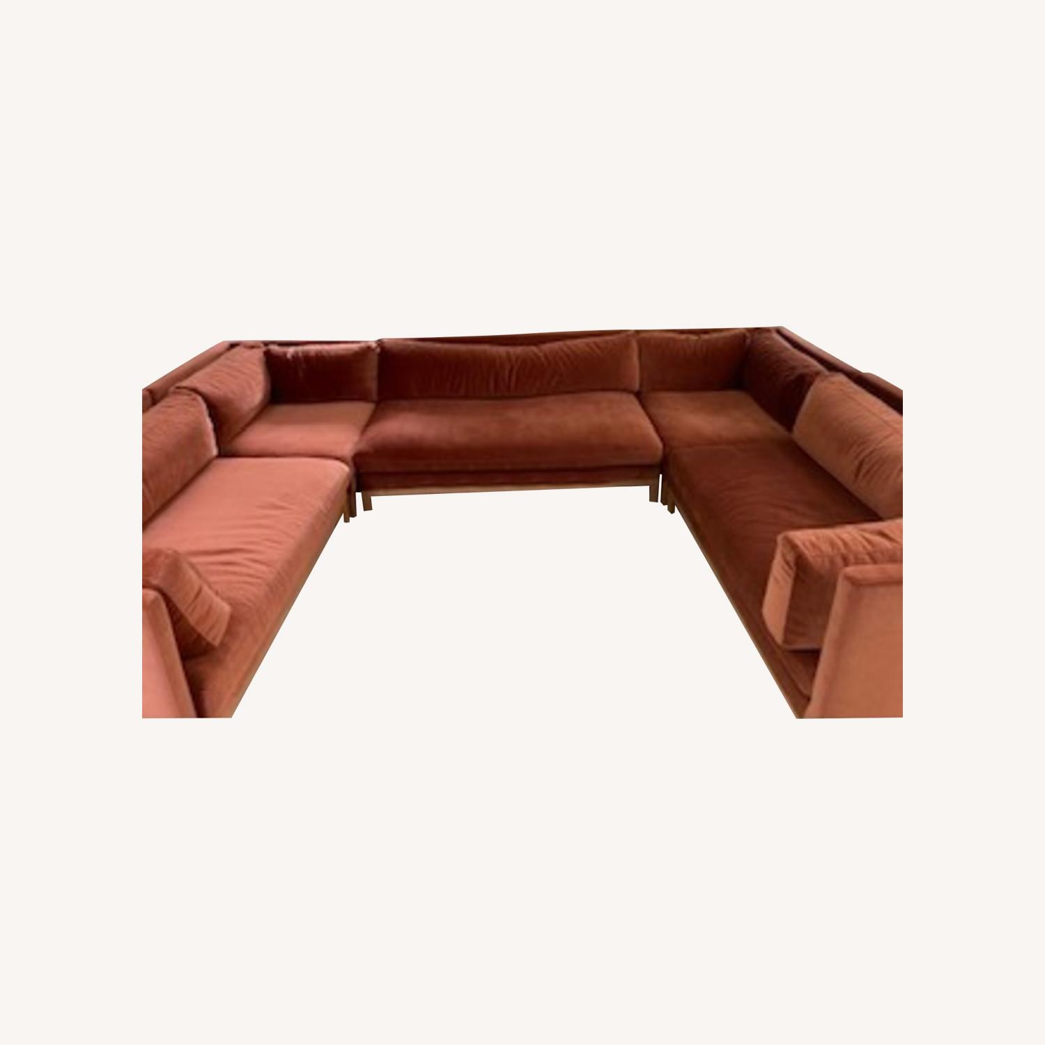 Seller's Notes:This is a gorgeous Rust velvet on a solid oak frame U shaped sectional sofa by Interior Define. The couch is 130 inches long, seats are 95.5 inches deep, cushion depth is 33 inches, the seat is 28.5 inches tall with a 67 inch opening in the center creating a U shape. Lightly used, very much loved. It is an incredible sofa. Like the perfect pair of relaxed-fit jeans, the Jasper sectional combines comfort and style. We consider it our ultimate lounging sectional. Clean lines, including a simple, solid wood rail, keep the overall design sleek with a hint of California-cool. The layered cushion is soft, yet supportive, and can be upgraded for an extra-soft sit and fully reversible cushion. With so many configuration options, the possibilities are endless.