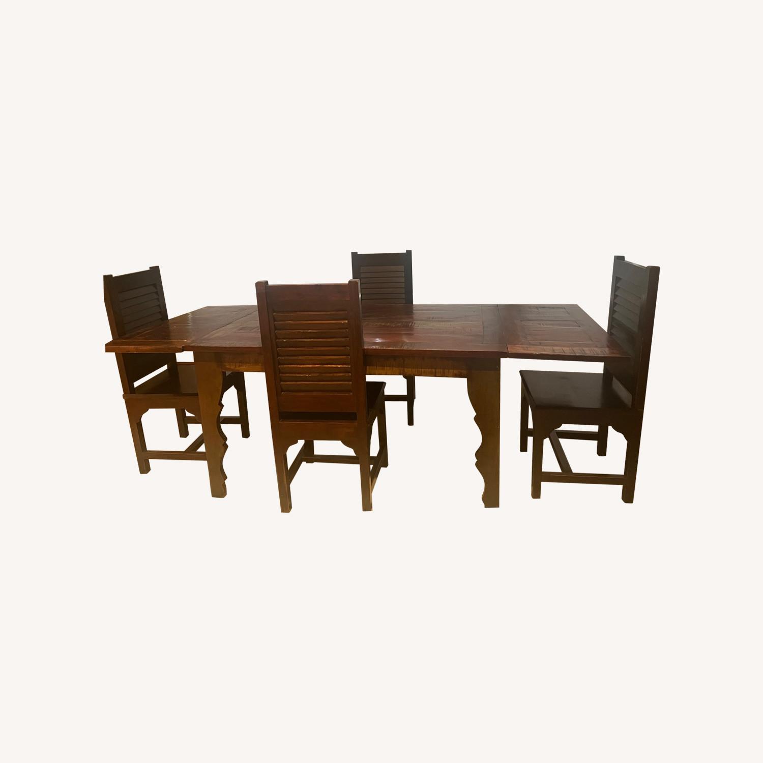 Seller's Notes:Rustic 5- piece reclaimed hard wood, dining table set with shutter back chairs and option to extend and use as a 4 seater or 6 seater table with ease. Overall dimensions- 89”W, 36”D With extenders- 54”W, 36”D Make every meal fun and relaxed with our Rustic and Whimsical five piece table and chair set. This playful dining set is made of reclaimed hardwood so it's also eco-friendly. The rectangular table has patches of color and triangular legs with intricate corner designs. The high shutter-back chairs have matching front legs. Materials - This colorful kitchen table and chair set is built by hand from reclaimed hardwood. Similar comparables available online - https://www.sierralivingconcepts.com/product/4386/rustic-reclaimed-wood-dining-table-w-shutter-back-chairs-for-4-people The wood has been carefully selected old wood with unique surface colors, history, and superior quality. Finish - Time and the elements age and perfect the surface of old wood. Features - This delightful dining table and chair set features a table with a slight lip over the frame, high back chairs with wide seats, and decorative table and chair legs. Craftsmanship - Done by old world artisans that use time honored techniques to cut and assemble this rustic five piece dinette set. Note: Reclaimed wood furniture is handcrafted from decades-old reclaimed solid wood. These items are hand-stained therefore, no two pieces can always be identical and slight variation should be expected. Great deal! Negotiable- Genuinely interested buyers only.