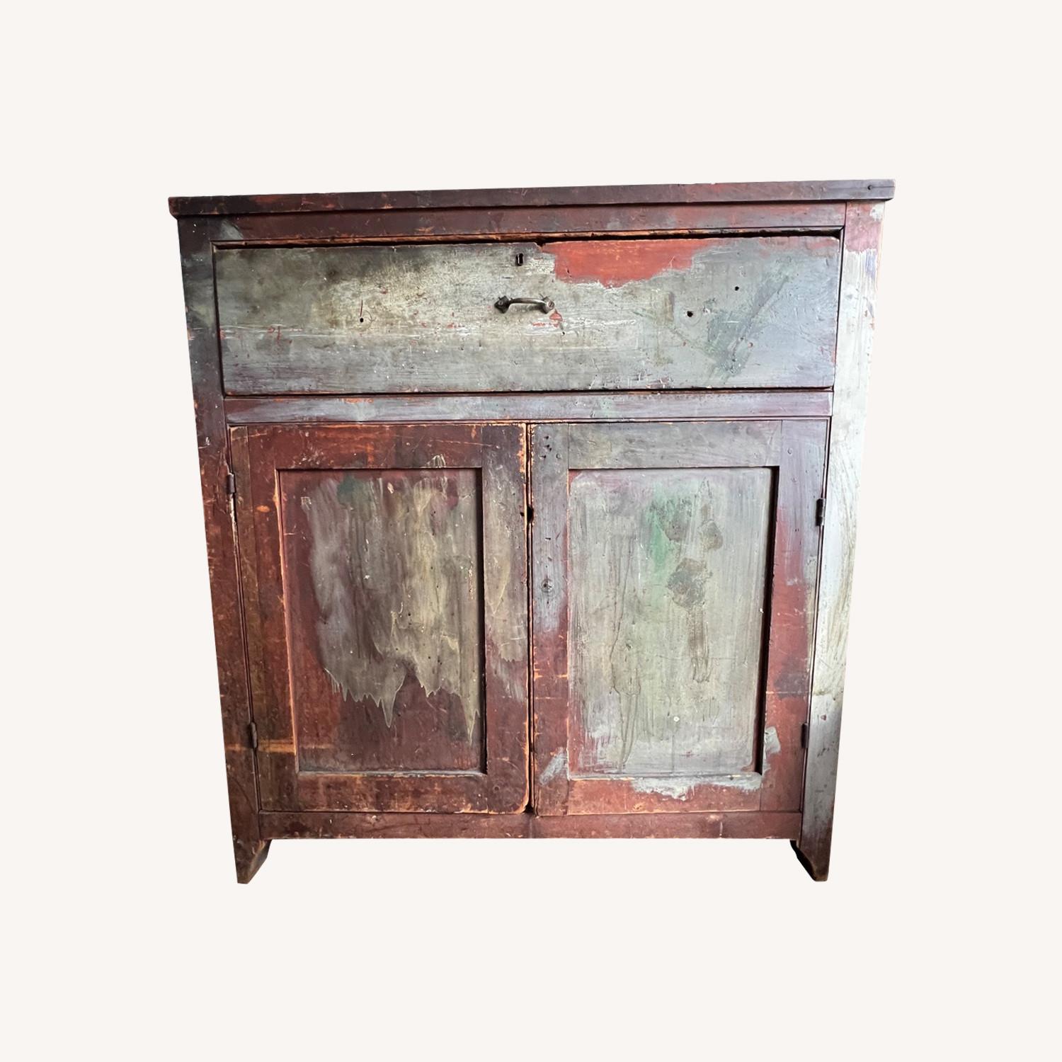 Seller's Notes:I purchased this from an antique shop in Annapolis, MD around 2002. It does not seem to be factory made and I am guessing that it could be from the 1920s-40s, but I really don’t know. It has a lot of rustic charm and character from evidence of various paint jobs and hardware changes (all before its time with me). It has been very functional in my home, holding books, plates, and stationery over the years. The back left foot is missing a piece so I always tried to hide that side, but it hasn’t compromised its stability. Also there is a large crack on the underside of the drawer, but it has been there the whole time and still has been fine to hold a lot in the drawer.