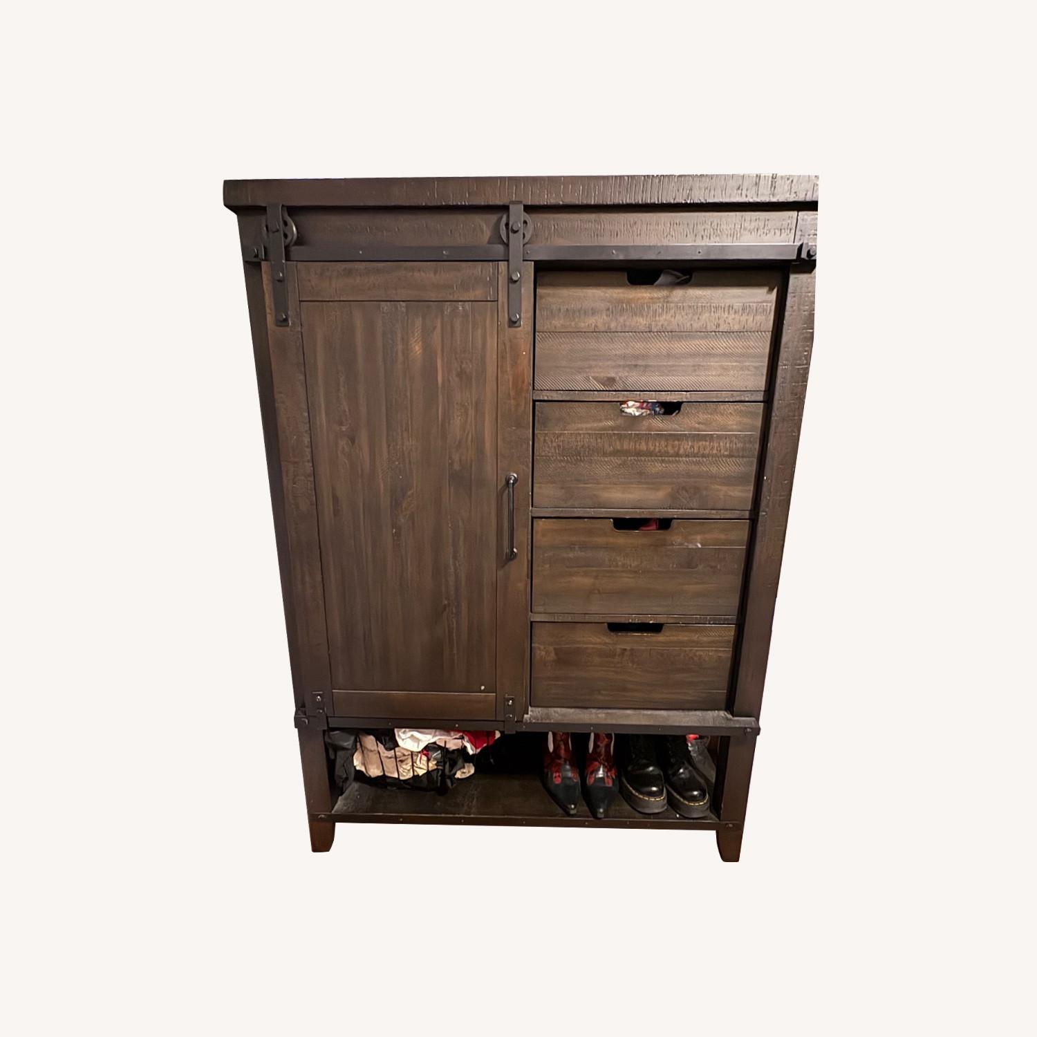 Seller's Notes:Durable rustic dark brown armoire with 4 drawers and sliding door with 4 shelves. Large open space below to store even more items. TV sits perfectly on top! I am looking to get rid of this (and the matching bed) to make room for my new furniture.