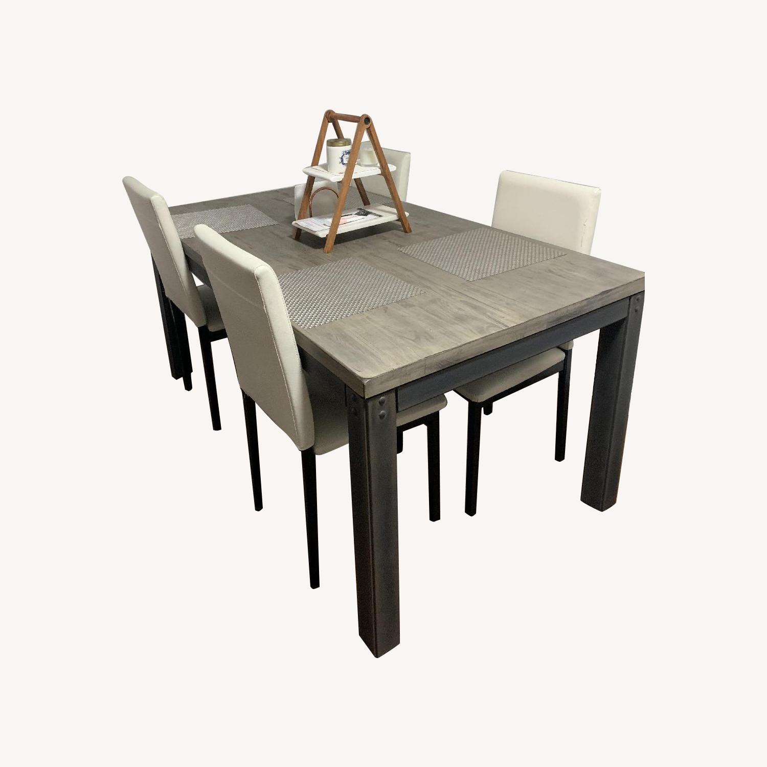Seller's Notes:Both items under a year old, colors go perfect together! White leather chair set of 4, great condition. Rustic grey finish wood dinning room table, In amazing condition. (31 inches high x 65 inches wide x 36 inches deep)