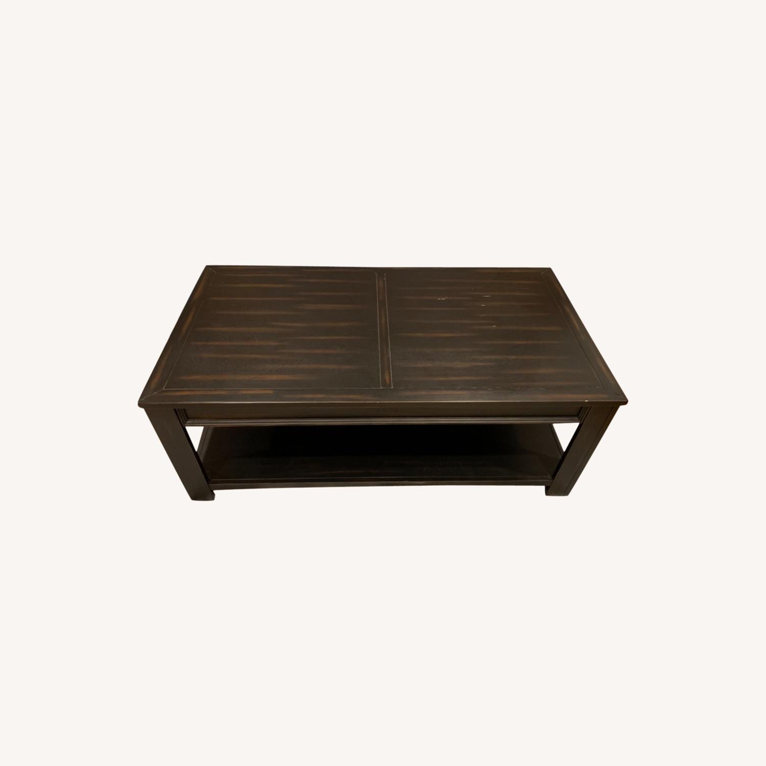 Seller's Notes:Up for sale is this Rustic Espresso Coffee Table. This table features a very stable design. It offers additional bin storage below which is a perfect space solution for NYC apartments. The dark espresso wood stain is sure to match any design choice.